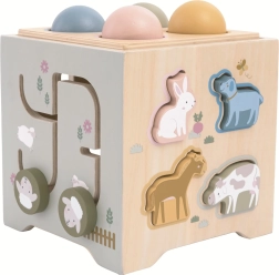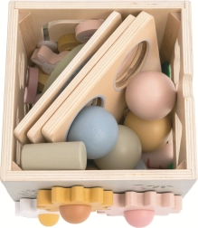 Šis kokybiškas medinis motorinis kubas su švelniomis pastelinėmis spalvomis ir žaviomis gyvūnėlių iliustracijomis skatina natūralų vaikų smalsumą. Dėka 5 žaidimo pusių ir keičiamų dangtelių jis suteikia daug būdų mokytis ir linksmintis – nuo formų ir gyvūnėlių rūšiavimo, dėliojimo ir sukiojimo iki pirmųjų skaičiavimo įgūdžių. Po žaidimo visas dalis paprasta sudėti į vidų, tad namuose išlieka tvarka.