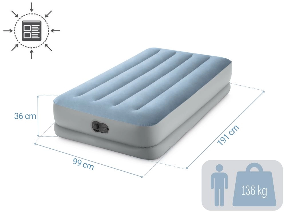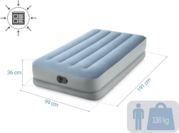 Praktiška ir patogi pripučiama viengulė lova, kurios matmenys 191 × 99 × 36 cm. Dėl Fiber-Tech ir Dura-Beam technologijų siūlo stabilią atramą, minkštą veliūrinį paviršių ir ilgą tarnavimo laiką. Integruotas USB elektrinis siurblys užtikrina greitą pripūtimą bet kur – nuo powerbanko, įkroviklio ar USB lizdo. Didžiausia apkrova 136 kg, komplekte yra nešimo krepšys ir taisymo pleistras.