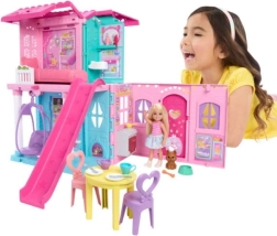 Rinkinyje yra lėlė Chelsea, mielas šuniukas, baldai ir smulkūs priedai – lėkštutės, stalo įrankiai, dantų šepetėlis, pasta, dubenėlis ir žaislas šuniukui.