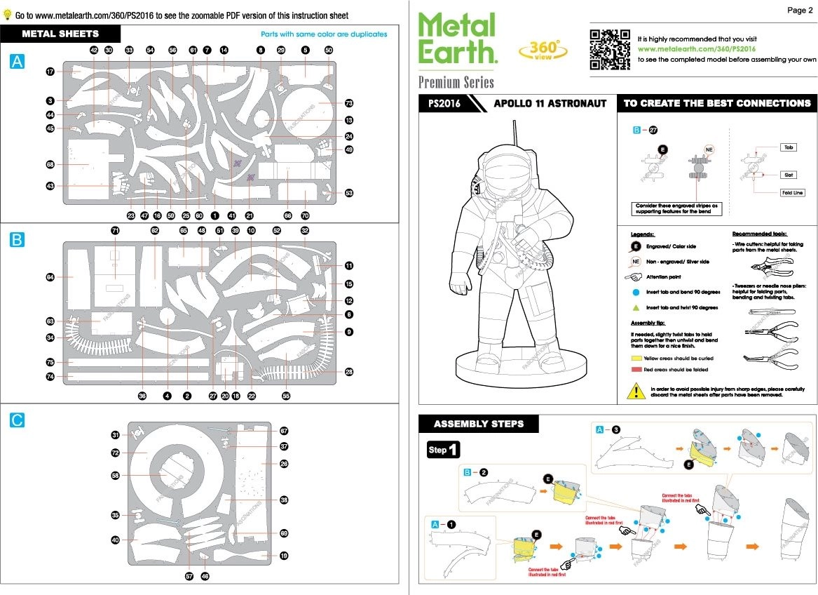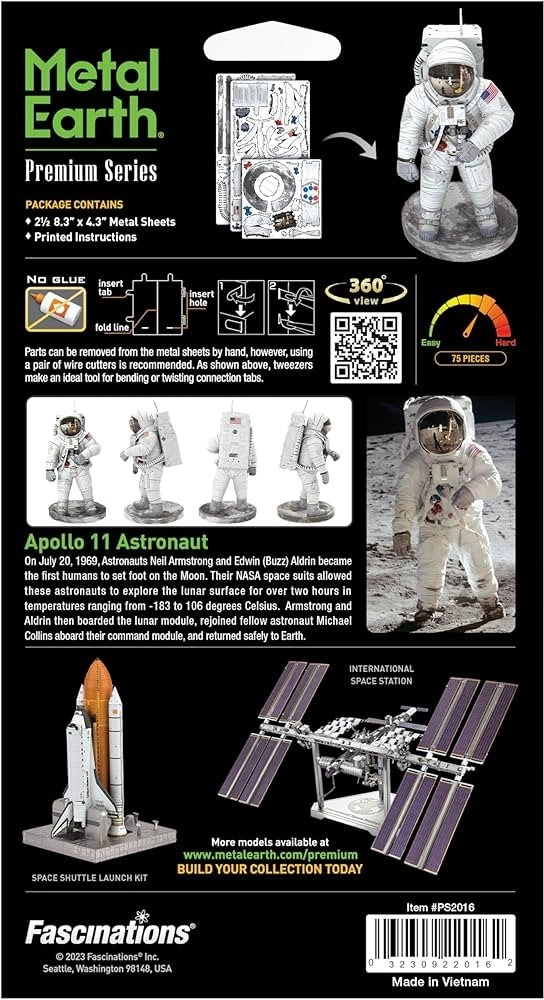 Atraskite tikslios metalinės modelistikos džiaugsmą su prabangia METAL EARTH serija. Iš plokščių kvadratinių plieno lakštų surinksite realistinę Apollo 11 astronauto miniatiūrą su subtiliu lazeriniu graviravimu, kuris pabrėžia kiekvieną skafandro detalę.