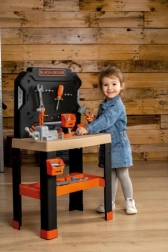 Realistiškos vaikų dirbtuvės Smoby Black+Decker Bricolo Center siūlo didelį, tvirtą darbo stalą su 78 priedų dalimis ir 7 įrankiais. Platus darbo paviršius medžio dizaino, veržtuvai, slankiojantis liniuotė ir daugybė laikymo skyrelių garantuoja valandas kūrybos ir žaidimo. Taip pat yra smagi vinių kalimo funkcija ir dėmesys tvarumui – gaminyje yra mažiausiai 75 % perdirbtos medžiagos.