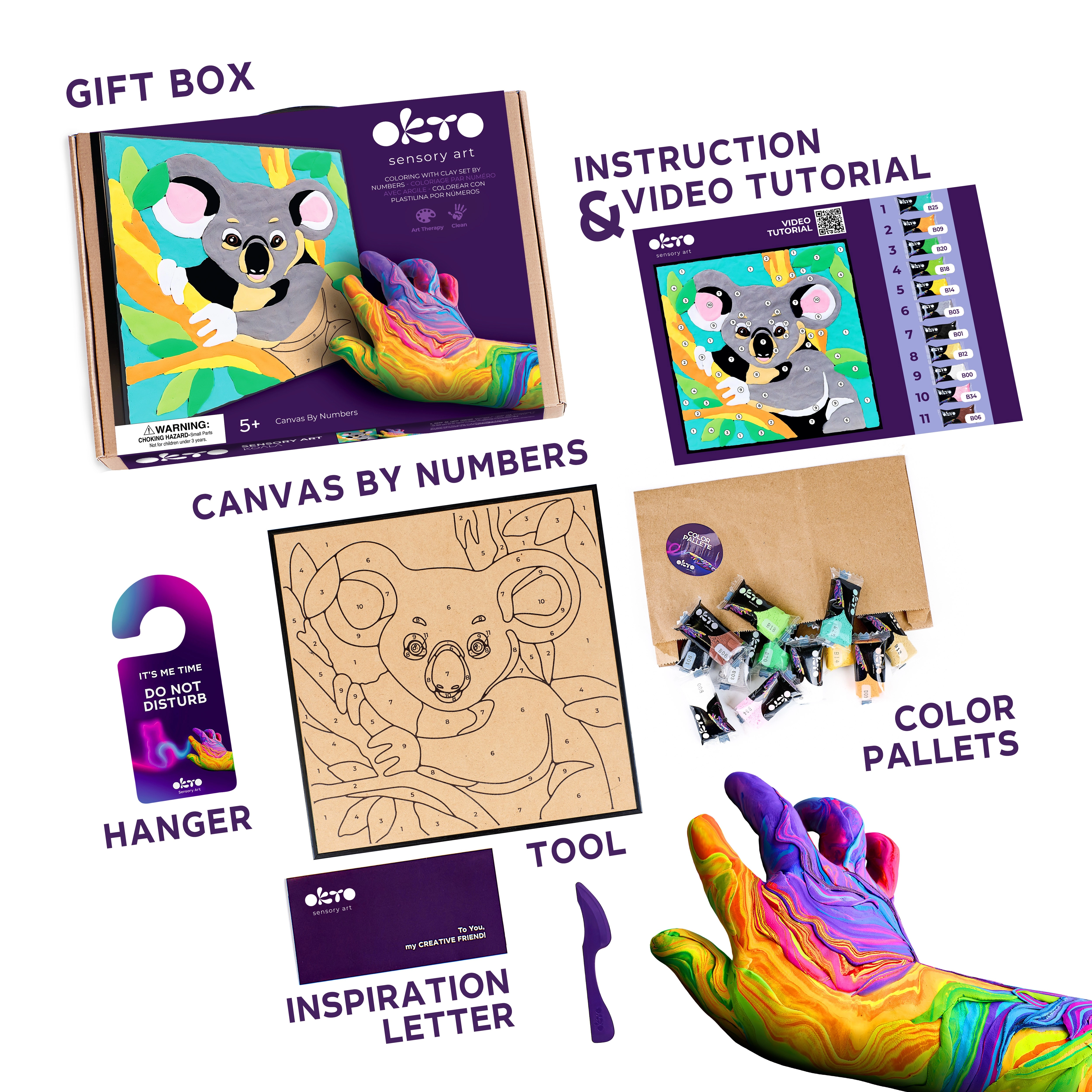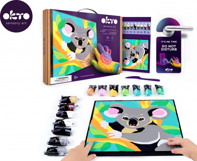 Sukurkite unikalų 3D paveikslą su koalos motyvu. OKTO rinkinys sukurtas taip, kad darbas būtų intuityvus ir smagus – tereikia sekti skaičius ir tepti spalvinę masę pridėtu modeliavimo įrankiu. Rezultatas – reljefiškas ir dekoratyvus, tinkamas eksponuoti vaikų kambaryje arba dovanoti kaip mielą dovaną.