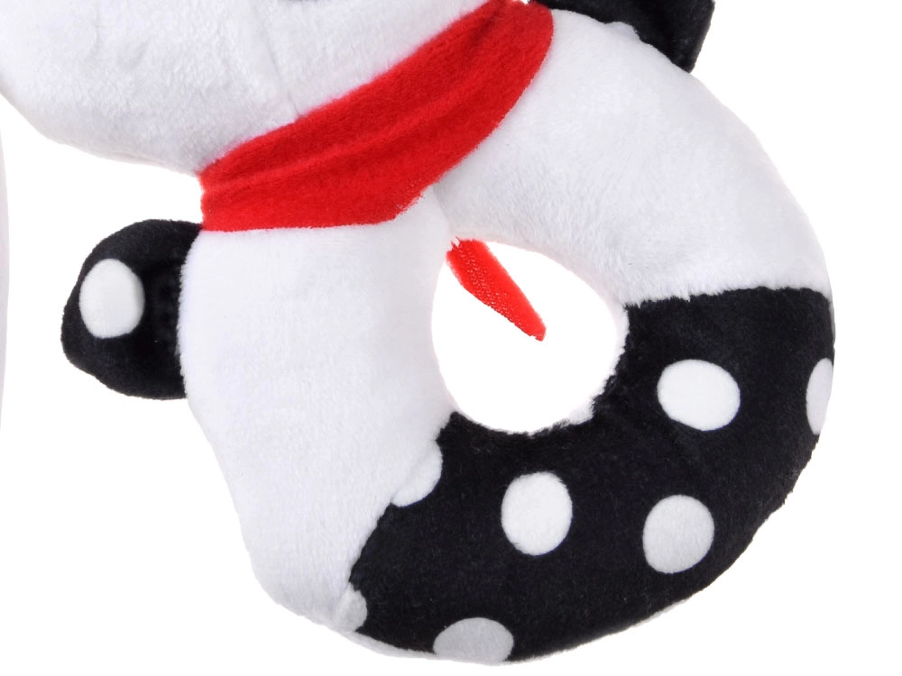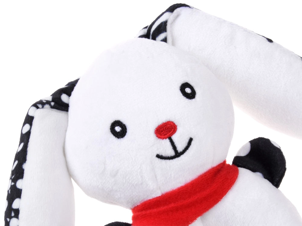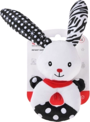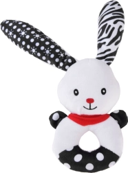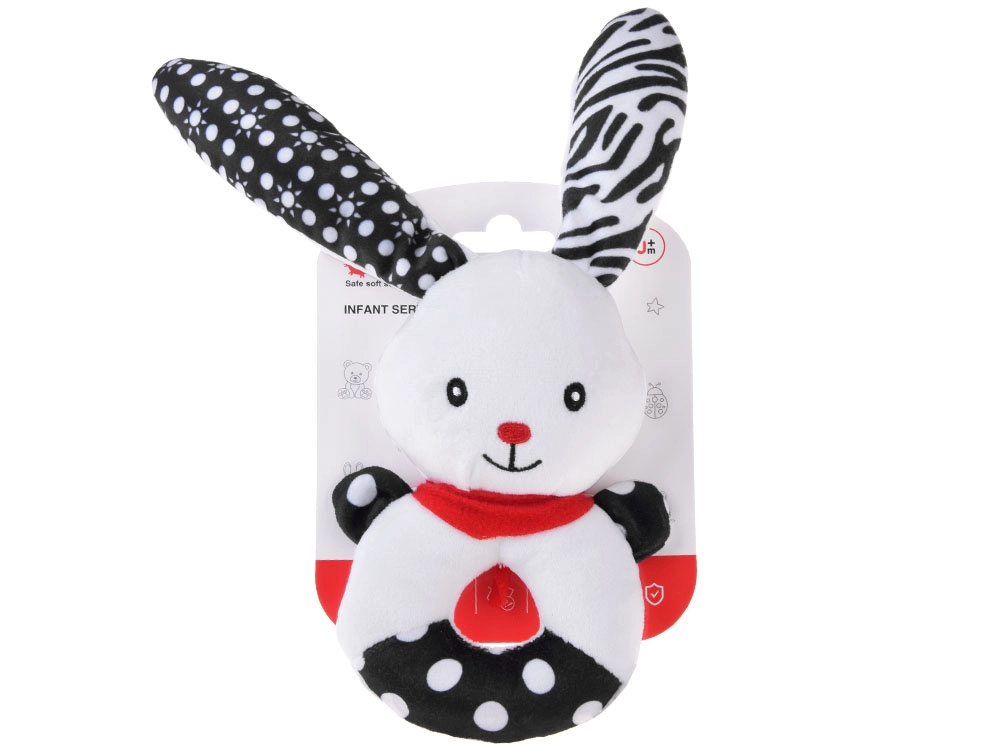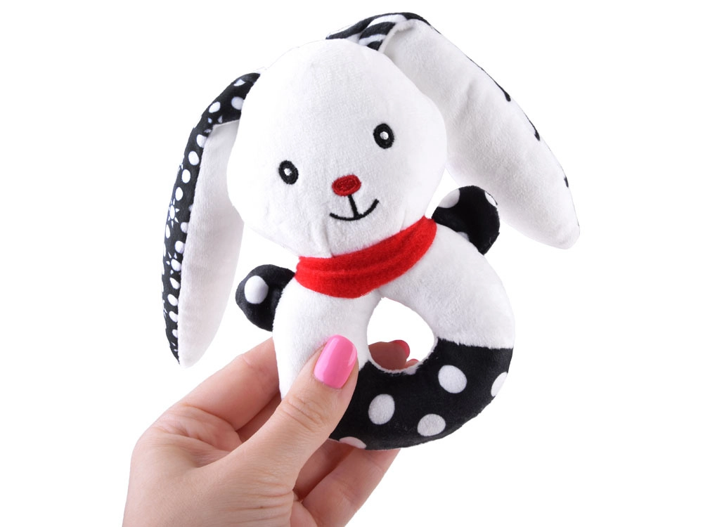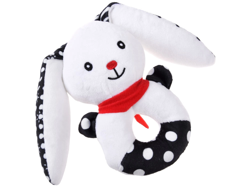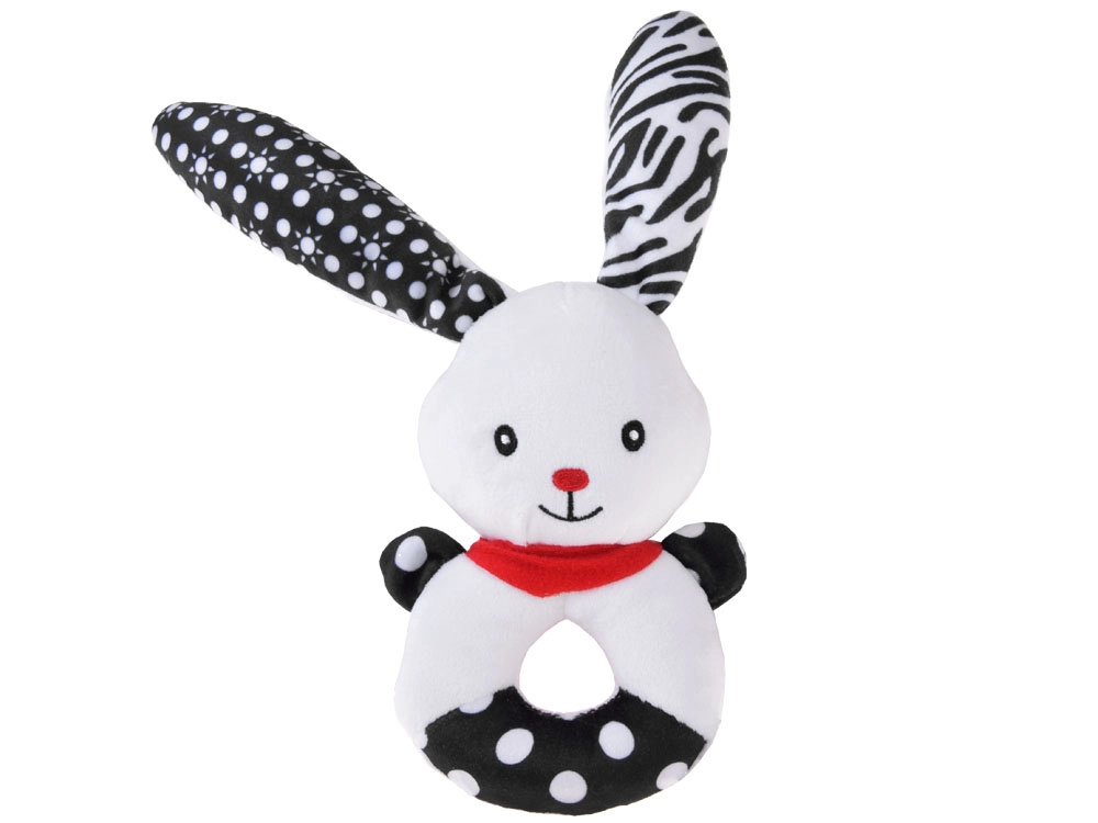 Mielas triušiuko formos barškučiai sukurtas patiems mažiausiems nuo pirmųjų mėnesių. Kontrastiniai juodai balti raštai su raudona nosyte ir skarele skatina regimąjį suvokimą, itin minkštas pliušas ir pirštinis žiedas palengvina suėmimą. Viduje yra švelnūs varpeliai ir cypsiukas, kurie suteikia garsinę stimulaciją ir žaidimo džiaugsmą.