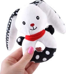 Šis minkštas kontrastinis žaislas apjungia barškučių, cypsiuko ir pirmojo glaudžiamo žaisliuko funkcijas. Apvali, lengvai suimama forma su anga viduryje, iškili galvutė ir ilgos ausytės padeda treniruoti smulkiąją motoriką ir akių–rankų koordinaciją. Kontrastiniai juodai balti motyvai kūdikiams yra puikiai matomi ir patraukia jų dėmesį.