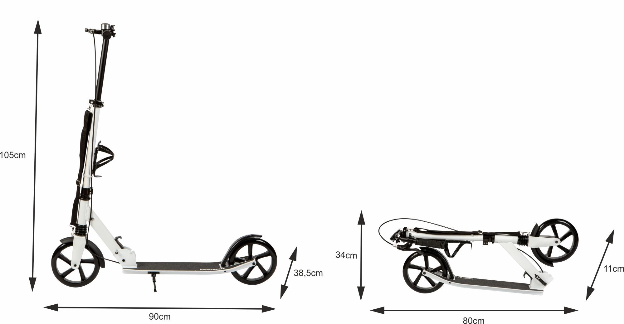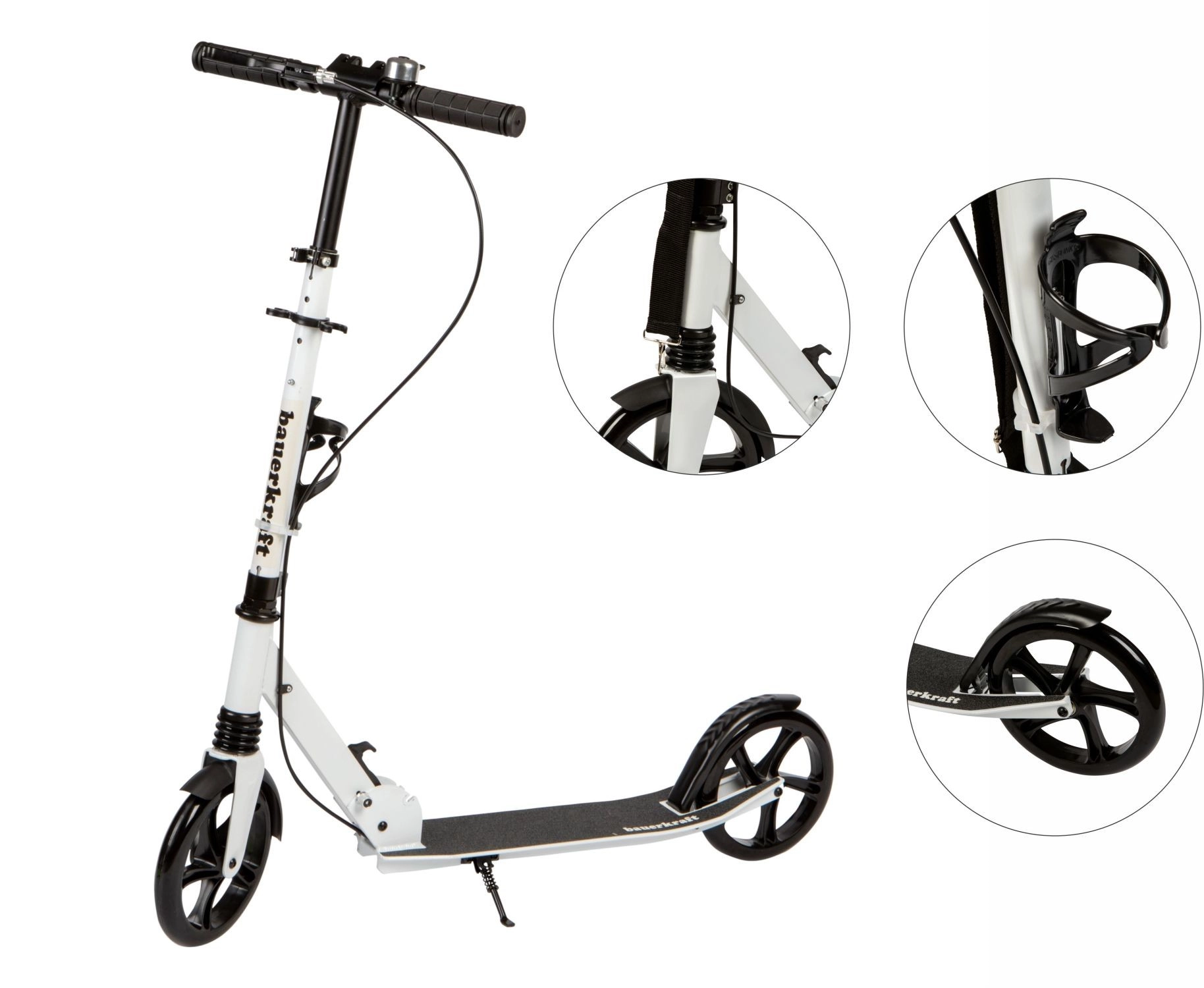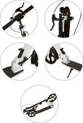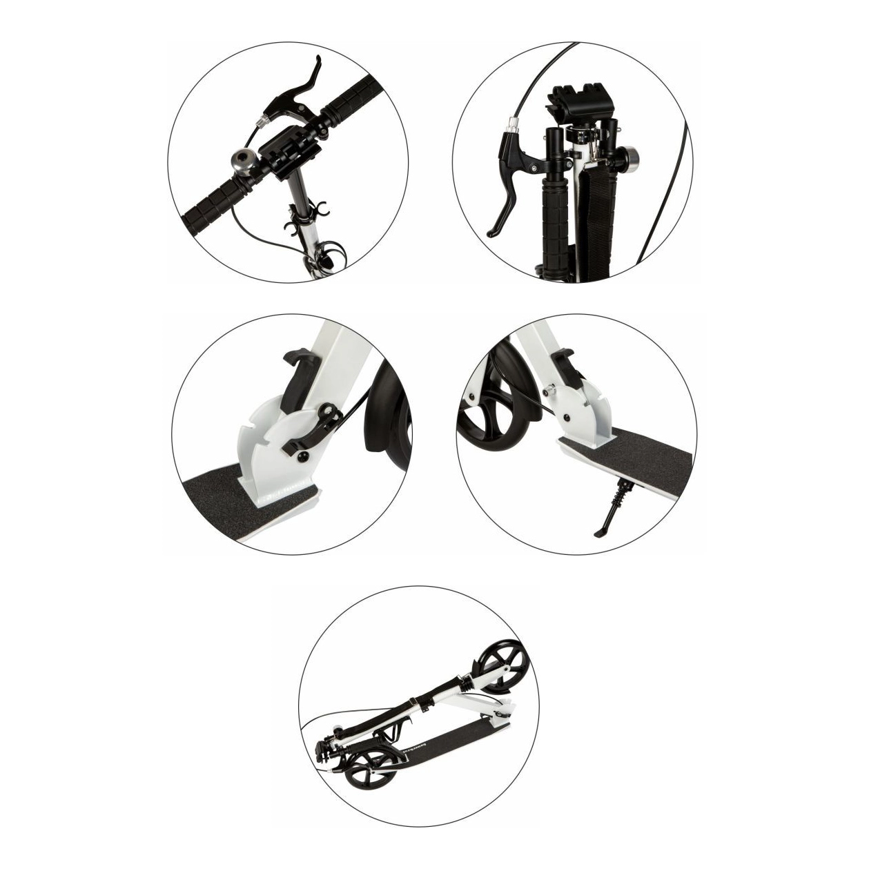 Saugumą sustiprina priekinis rankinis stabdis ir galinis pakojinis stabdis, kuris taip pat veikia kaip purvasaugis. Greitas sulankstymo mechanizmas su užraktais leidžia paspirtuką akimirksniu sulankstyti iki kompaktiško dydžio, todėl jį lengva nešti ir laikyti. Praktiškas buteliuko laikiklis gėrimą visada išlaiko po ranka, o integruotas stovas leidžia patogiai pastatyti.