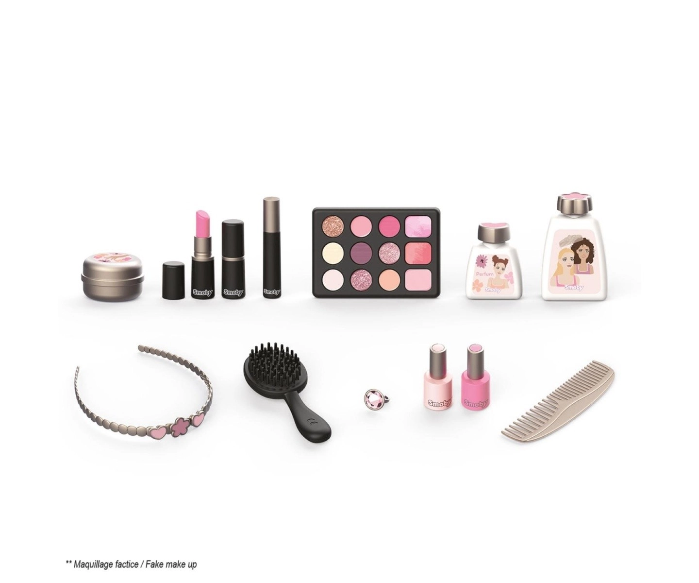 - 13 priedų – imitacijų: 2 nagų lakai, 2 lūpdažiai, akių šešėlių paletė, blakstienų tušas, šepetys, šukos, lankelis, žiedelis ir įvairūs buteliukai