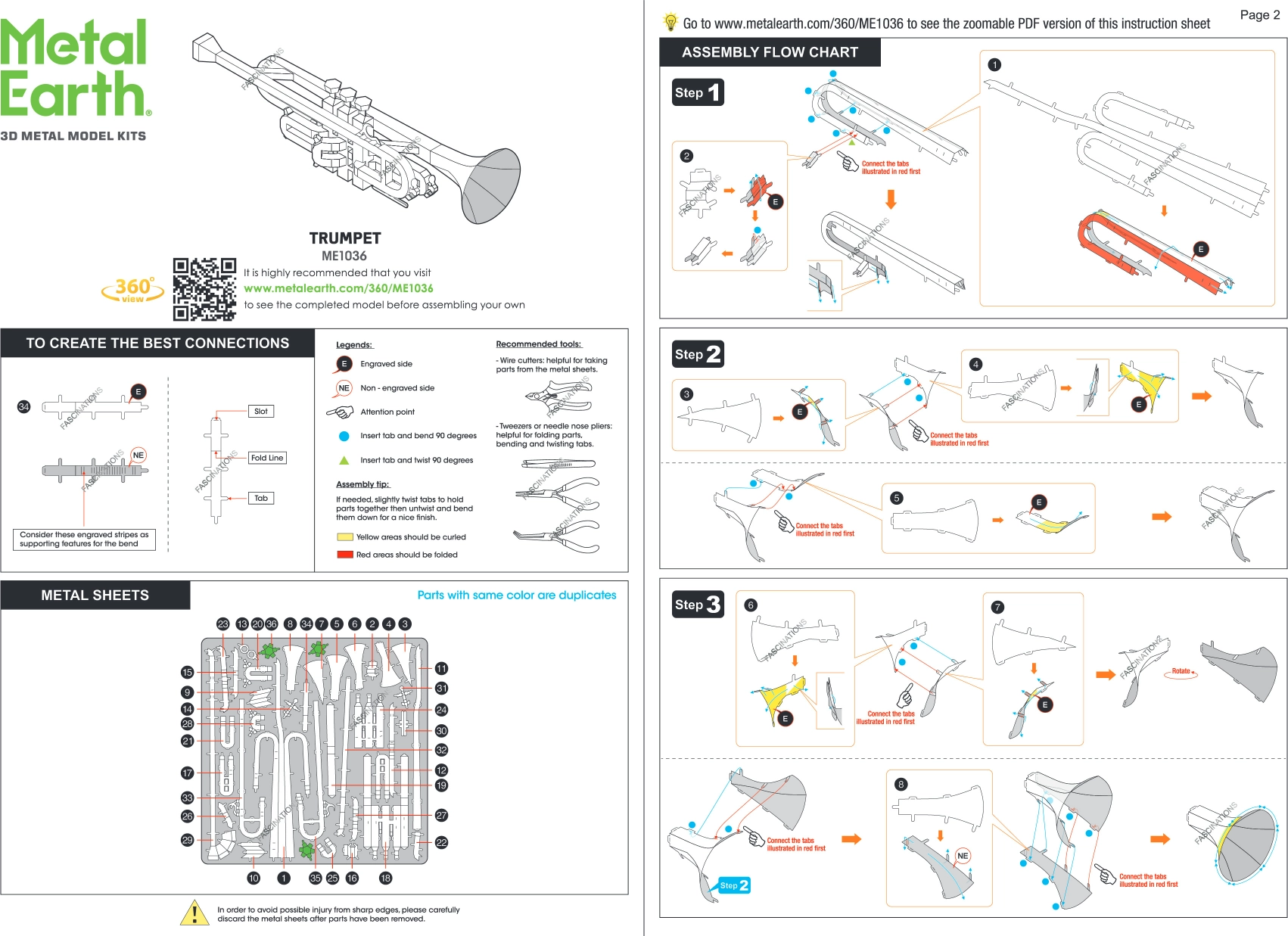 Surinkimas intuityvus: detalės jungiamos užlenkiant mažus „kabliukus“ į angas. Patogesniam darbui rekomenduojame mažas žnyplutes ir smulkias plokščias replutes (nepridedamos). Rezultatas – patvari metalinė miniatiūra, apie 9,7 × 2,3 × 3,1 cm dydžio, kuri pradžiugins ir pradedančiuosius, ir patyrusius kūrėjus.