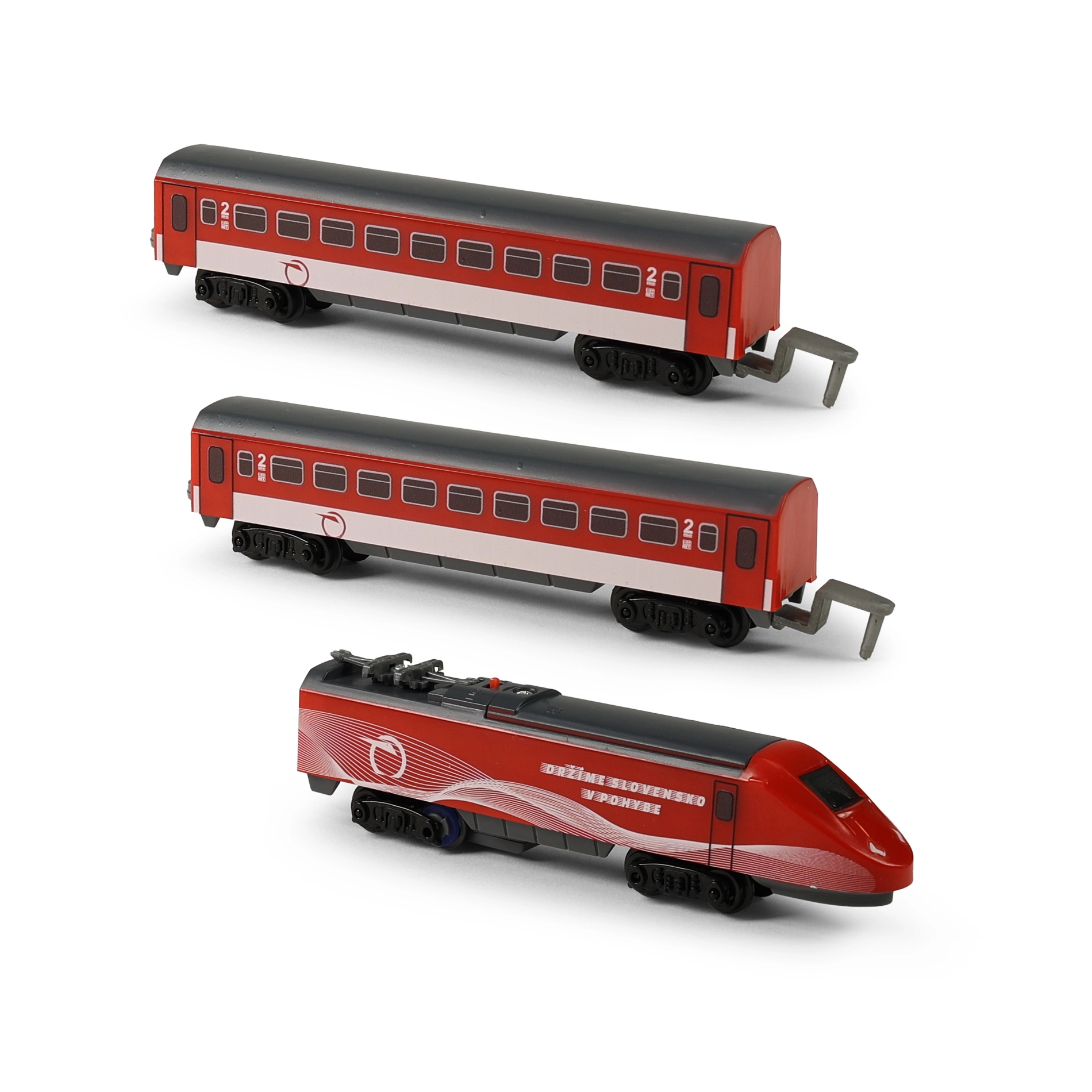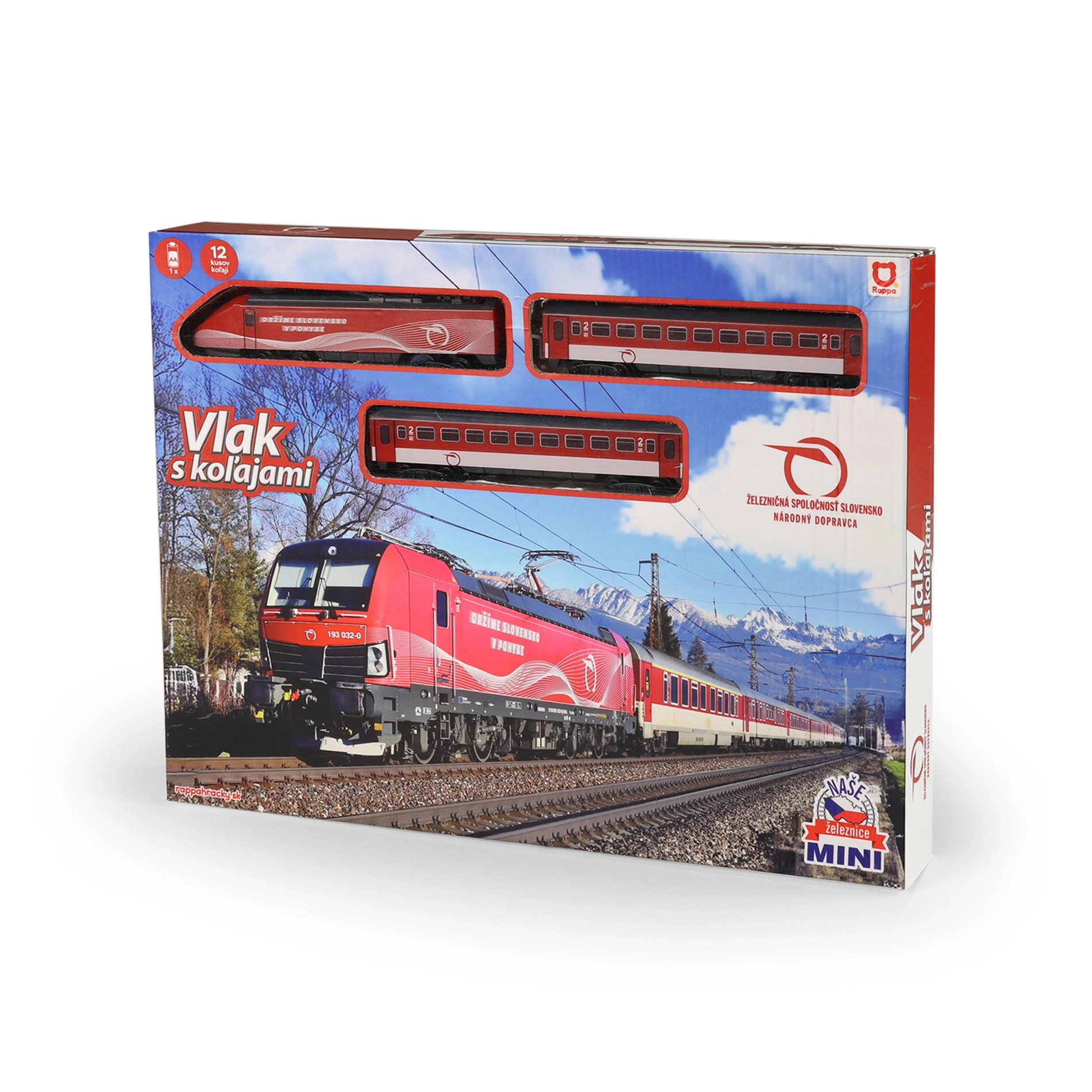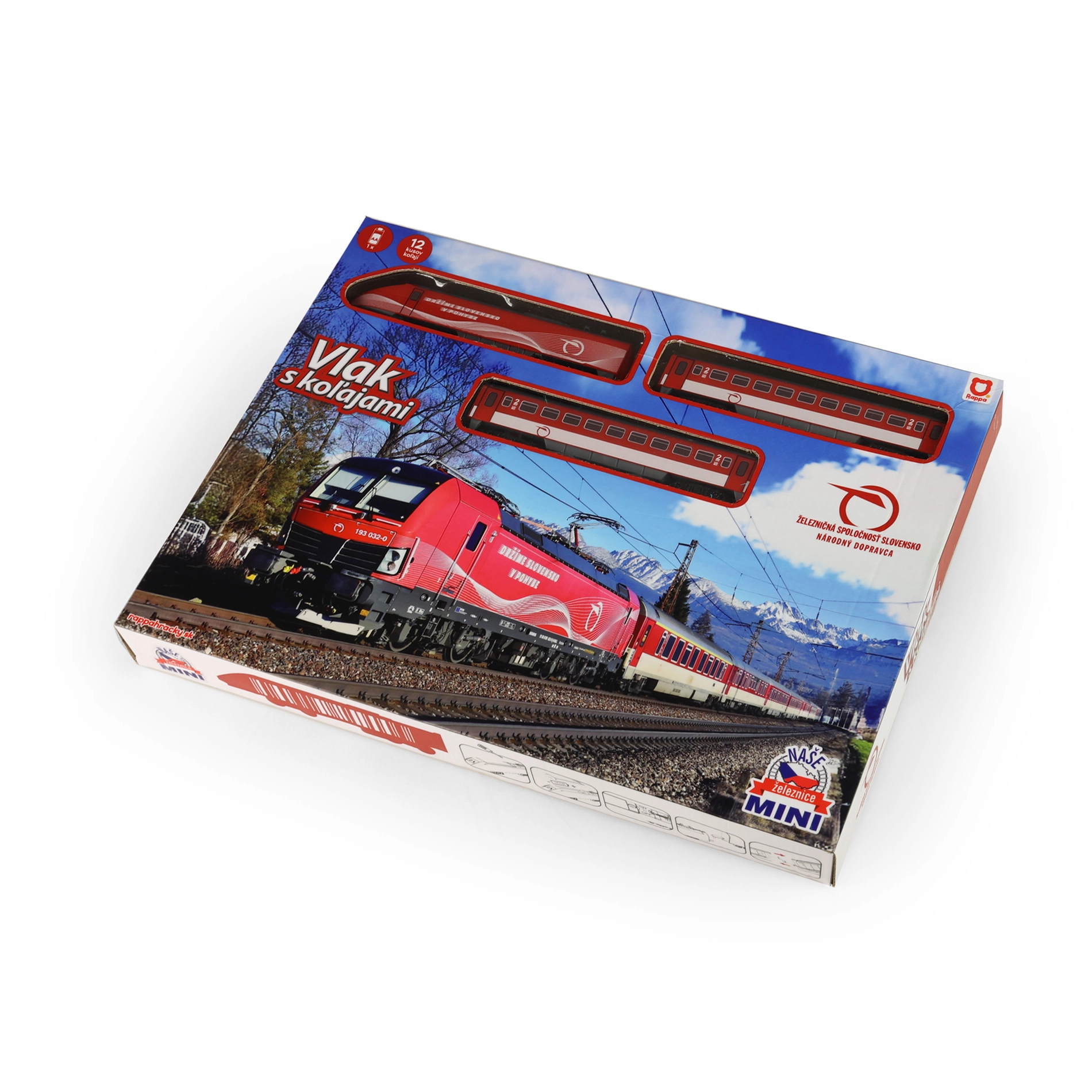 Susikurkite savo bėgių trasą ir leiskitės į kelionę su mini traukiniu Železničná spoločnosť Slovensko. Rinkinyje yra lokomotyvas ir 2 vagonai, 12 bėgių dalių, leidžiančių sudėti ovalą iki 96 × 58 cm, ir paprastas ON/OFF valdymas. Lokomotyvas važiuoja su 1× AA baterija ir yra suderinamas su REGIOJET MINI ir PENDOLINO MINI modeliais dar didesniam smagumui.