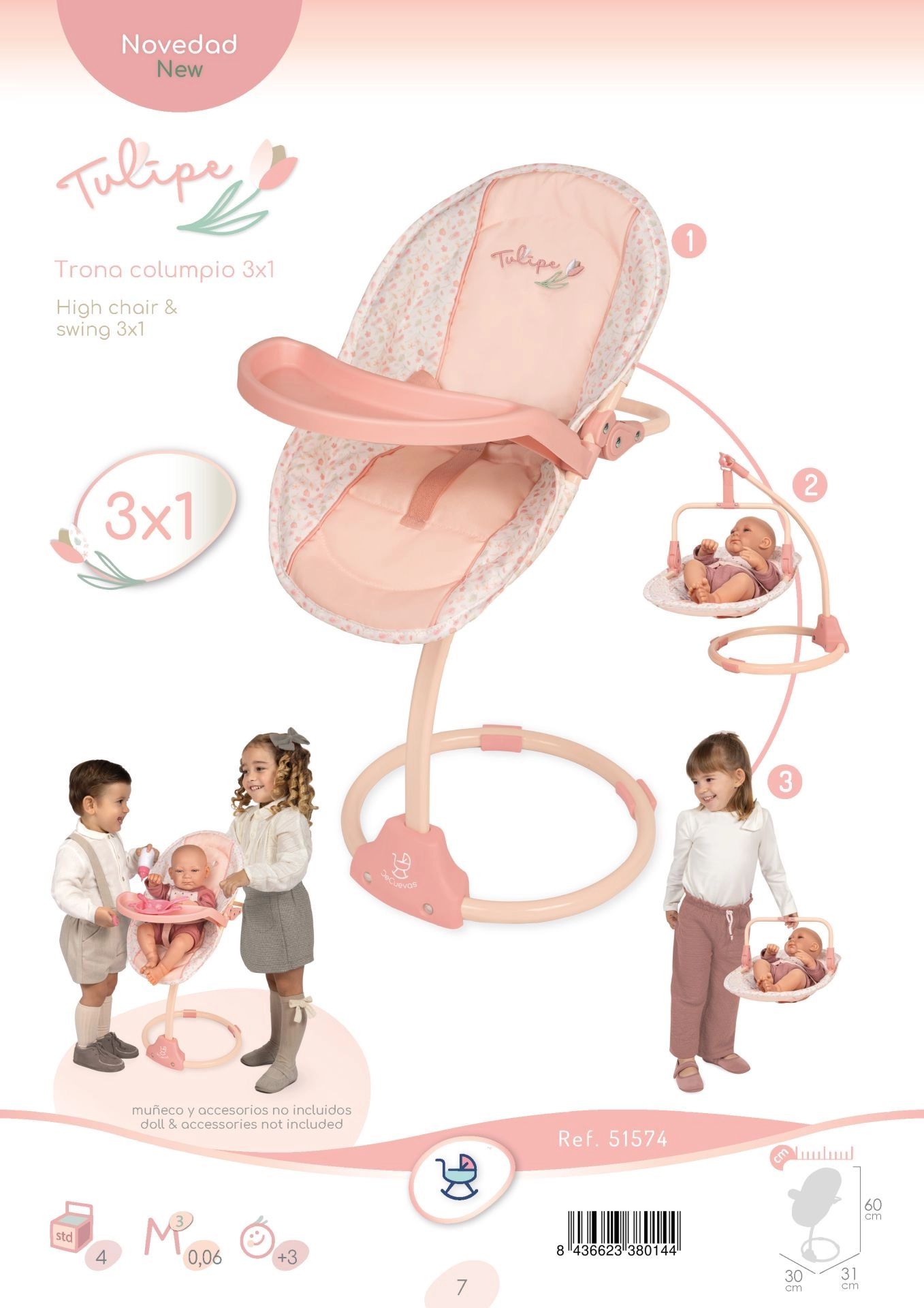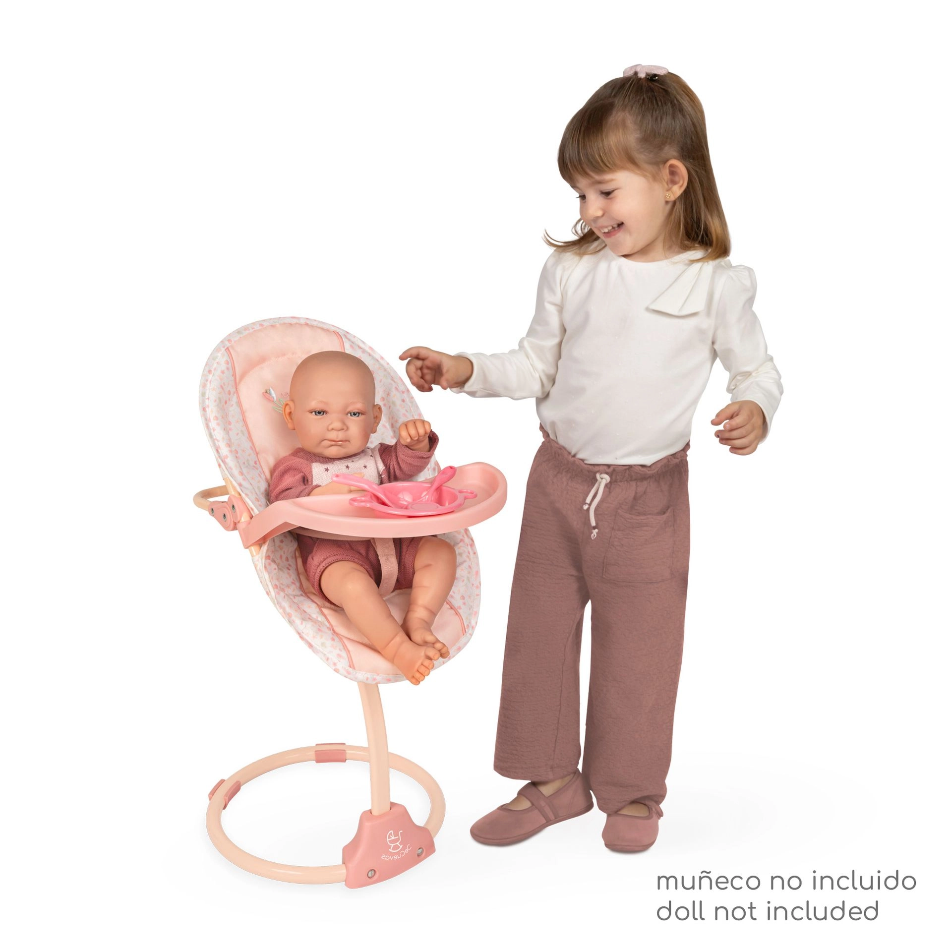 - Kėdutė/sūpynės, nuimama sėdynė, padėklas (lėlė ir priedai neįtraukti)