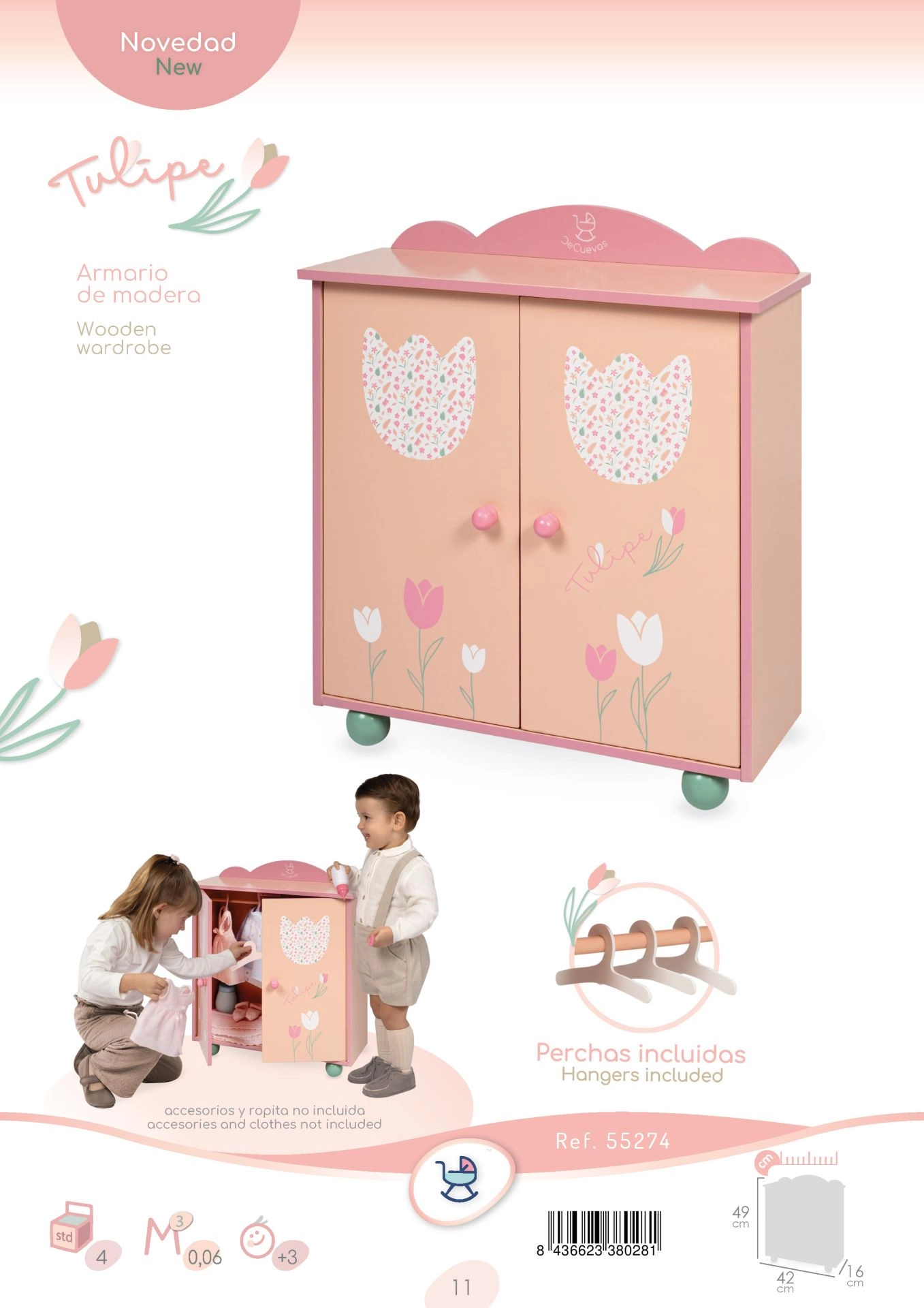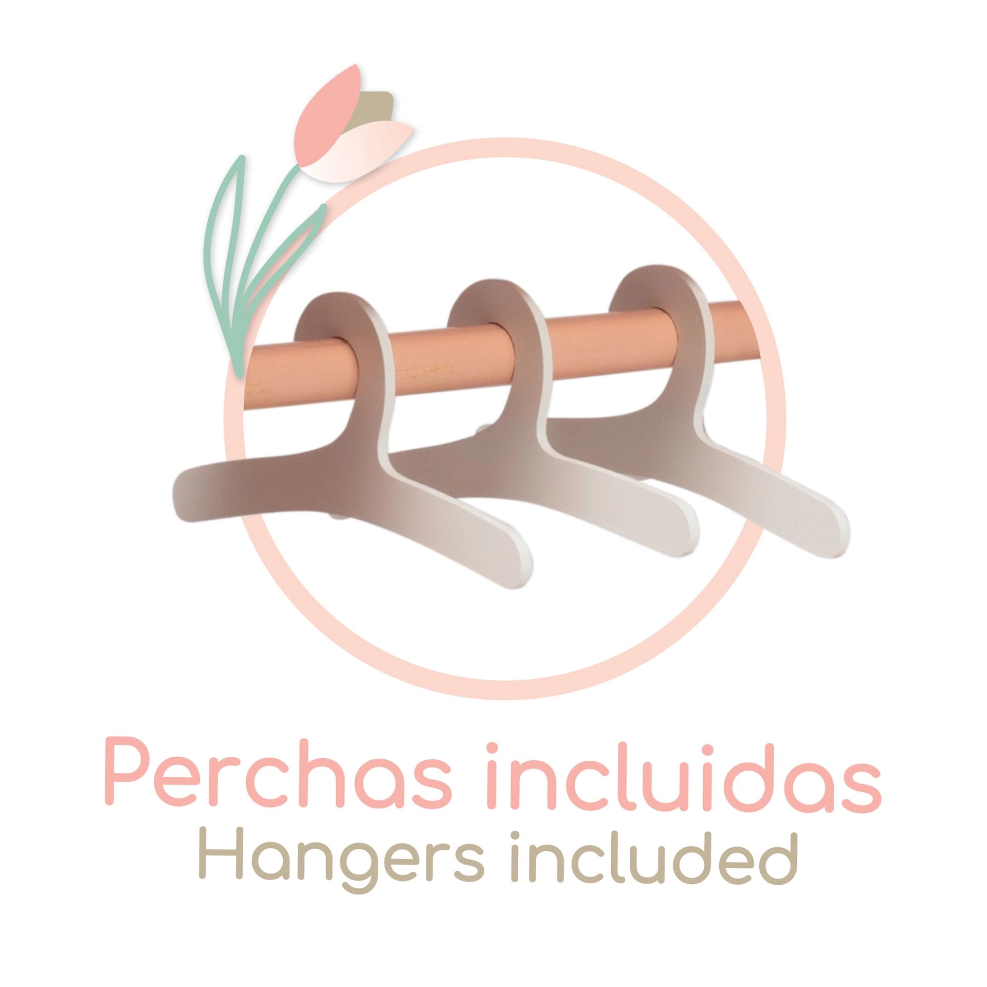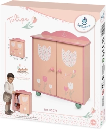 Suteikite vaikams elegantišką vietą jų lėlių rūbeliams. Medinė drabužinė iš TULIPE kolekcijos, šiltų lašišinių pastelinių atspalvių su subtiliu gėlių raštu, puikiai įsilies į bet kurį kambarį. Dėka drabužinės strypo ir trijų tvirtų pakabų mažosios stilistės viską turės po ranka ir tvarkingai sudėtą.