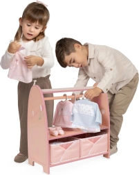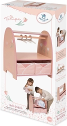 Padėkite vaikams palaikyti tvarką lėlių pasaulyje. Ši kompaktiška medinė TULIPE kabyklos versija siūlo praktišką sprendimą tiek kabinti, tiek laikyti drabužėlius ir aksesuarus. Drabužių skersinys su 3 medinėmis pakabomis tinka drabužėliams iki maždaug 19 cm ilgio, o apatinė lentyna ir 2 sulankstomi audiniai krepšeliai leidžia visa kita laikyti po ranka.