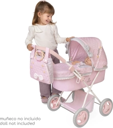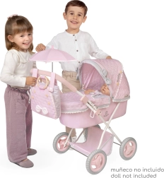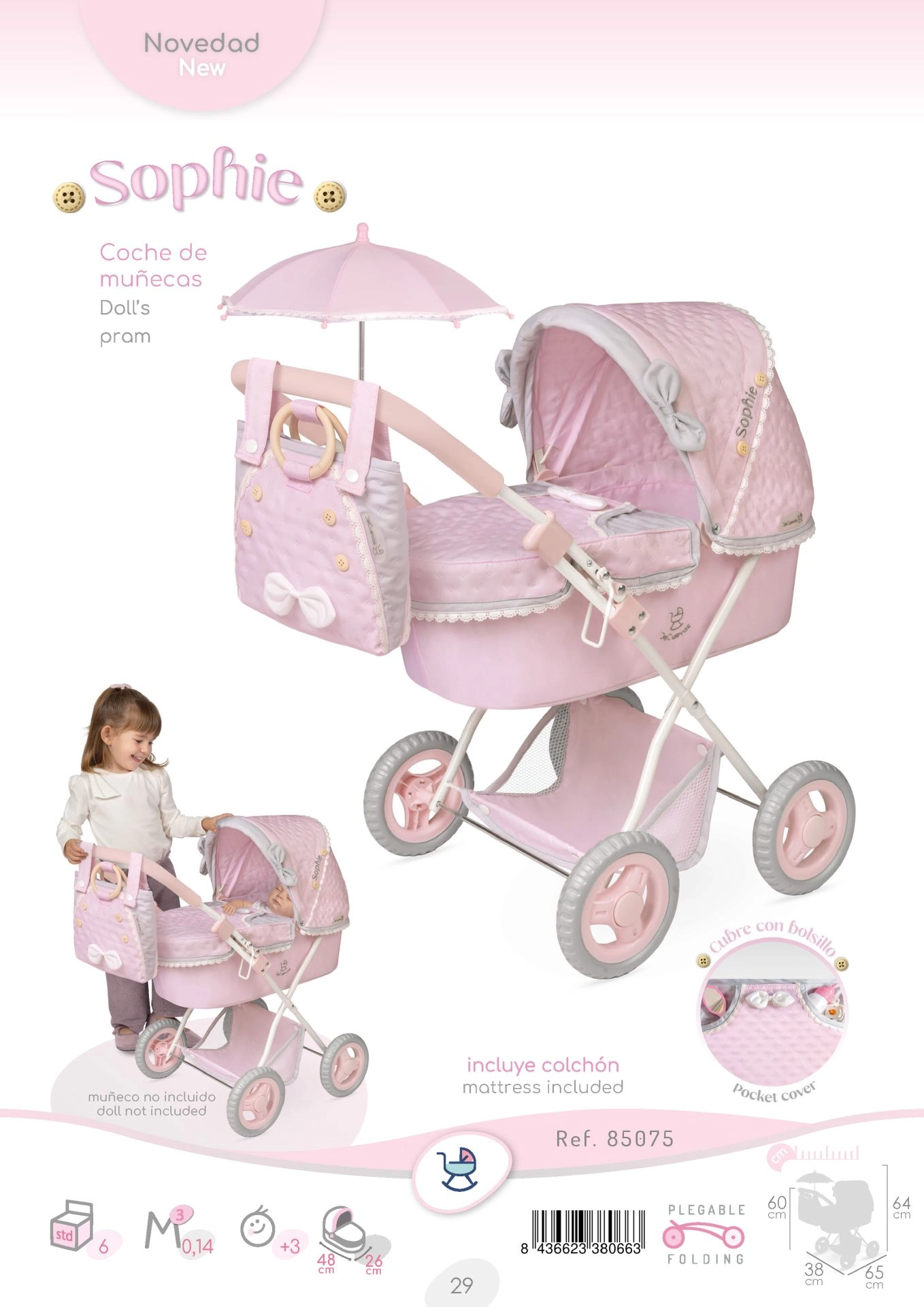 Atraskite romantišką lėlių vežimėlį iš SOPHIE kolekcijos su švelniais nėriniais ir kaspinėliais. Šviesiai rožinė spalva su pilkais ir baltais akcentais atrodo kerinčiai ir pabrėžia ispanišką dizainą bei precizišką apdailą. Sulankstymo mechanizmas užtikrina patogų laikymą ir nešiojimą, todėl vežimėlis paruoštas žaidimams namuose ir lauke.