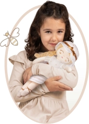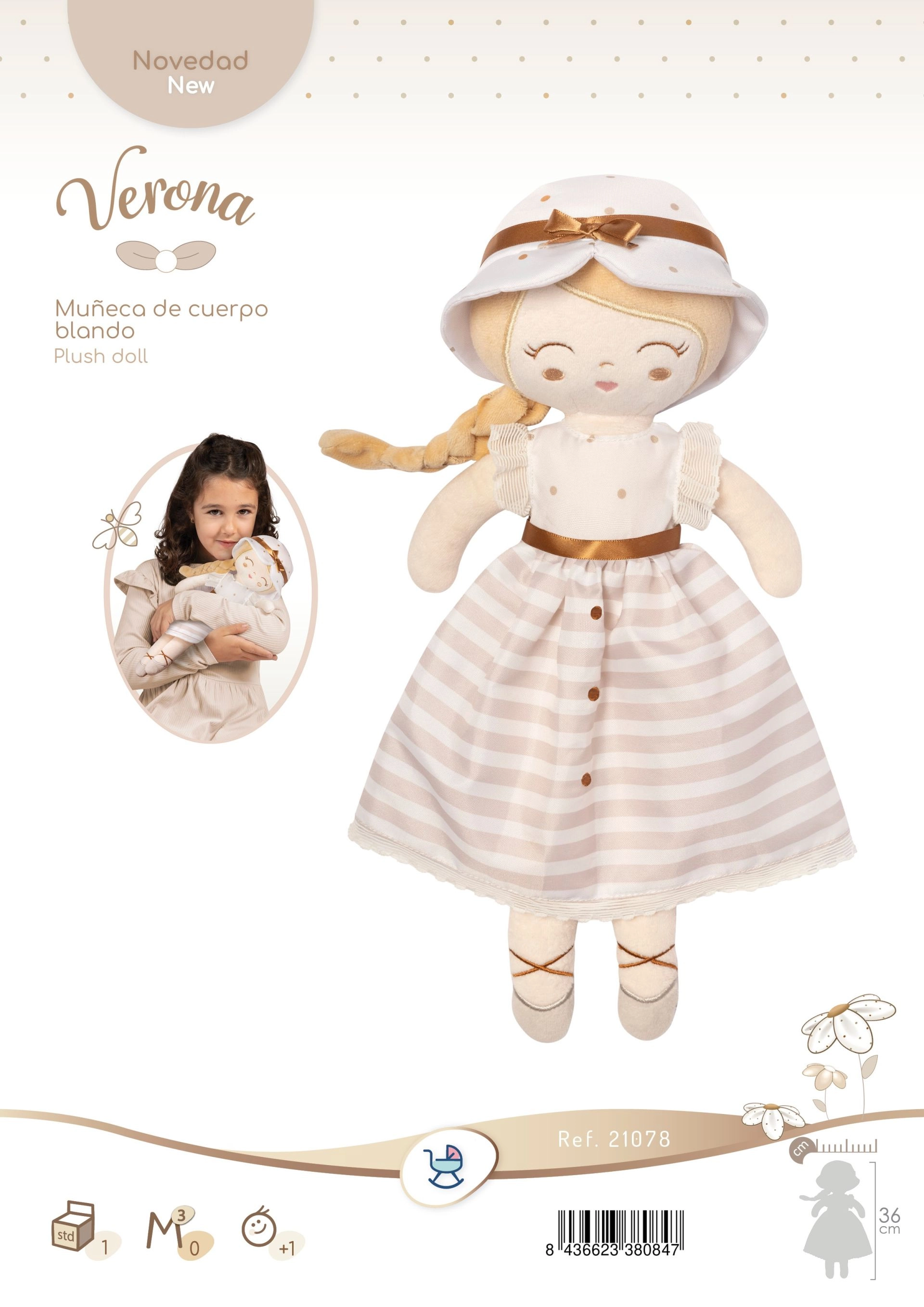 Pliušinė lėlė Verona 36 cm – mažytė draugė, įkvėpta gamtos atspalvių ir subtilių raštų, pasižyminčių laikui nepavaldžia išvaizda. Šviesiai rusvos ir baltos spalvų derinys su taškeliais ar juostelėmis, papildytas švelniu apsiuvimu, pabrėžia elegantišką ispanišką dizainą. Lėlė pagaminta iš kokybiško lygaus, blizgaus pliušo, kuris malonus liesti ir tinkamas kasdieniam žaidimui.