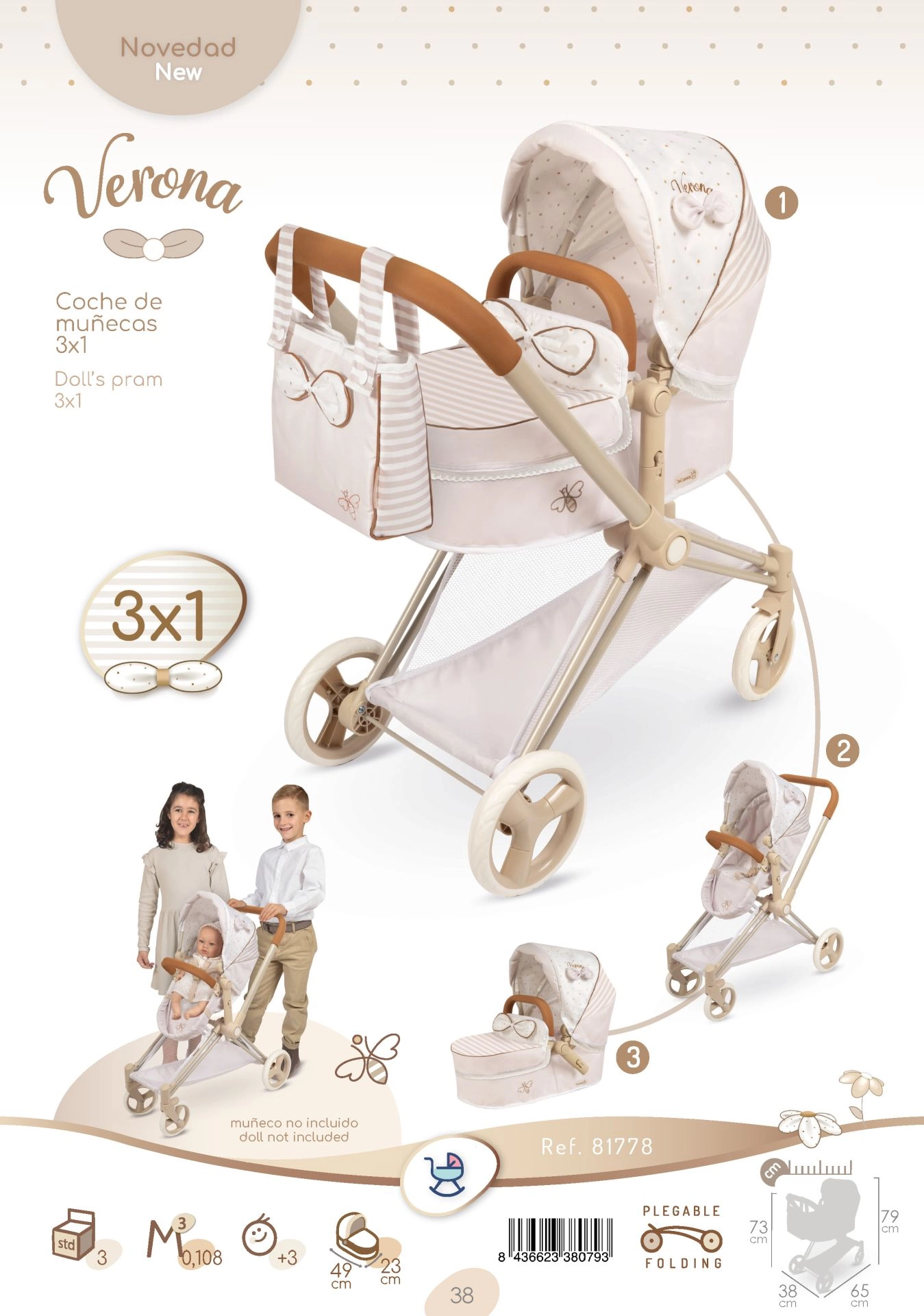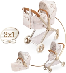 Elegantiškas vaikų 3 viename lėlių vežimėlis iš kolekcijos VERONA džiugina švelniu natūraliu dizainu, sulankstoma konstrukcija ir nuimama gilaus lopšio dalimi, kurią galima paversti sportine versija. Siūlo reguliuojamą stogelį, tritaškius diržus, pasukamus priekinius ratukus lengvam vairavimui bei praktišką krepšį ir daiktų krepšį. Puikus pasirinkimas vaikams nuo 3 metų.