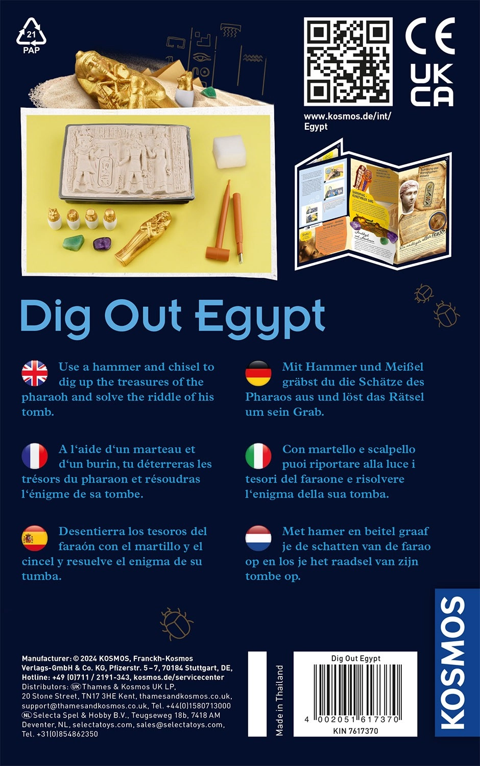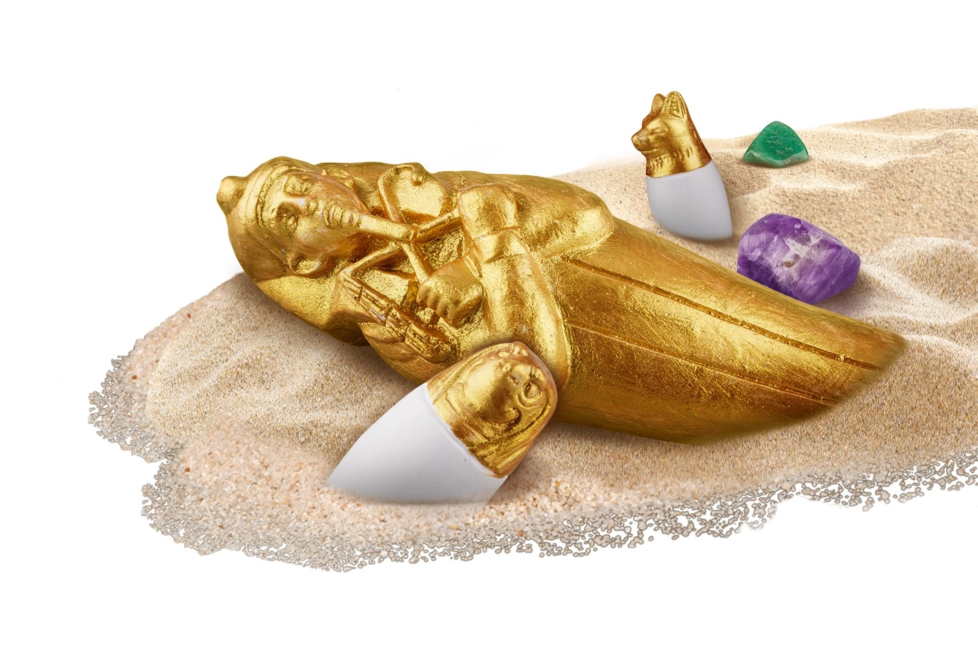 Atraskite senovės Egipto paslaptis su šiuo linksmu rinkiniu mažiesiems tyrinėtojams. 7–11 metų vaikai, naudodami pridedamus įrankius, patys gali atkasti gipso bloke paslėptus artefaktus. Pridedamas originalus paveikslinis vadovas anglų kalba su lietuvišku vertimu ir galimybe atsisiųsti lietuvišką instrukciją per QR kodą. Puiki dovana smalsiems vaikams, lavinanti kantrybę, smulkiąją motoriką ir domėjimąsi istorija.