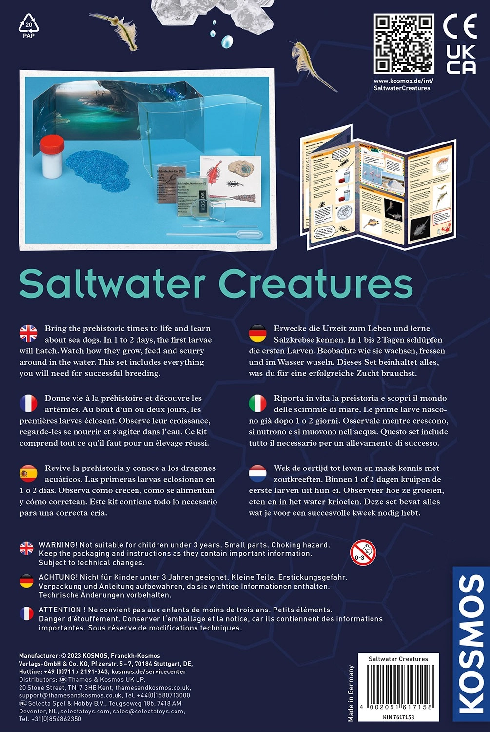 Atraskite žavų mažųjų vandens gyvūnų pasaulį su edukaciniu Kosmos rinkiniu, skirtu auginti sūrinę artemiją. Rinkinyje yra viskas, ko reikia lengvam startui: talpa, speciali druska, pašaras, kiaušinėliai ir lietuviškas vadovas, pasiekiamas atsisiųsti per QR kodą. Puiki dovana 8–12 metų vaikams, skatinanti pažintį su gamta ir mokslu.