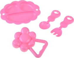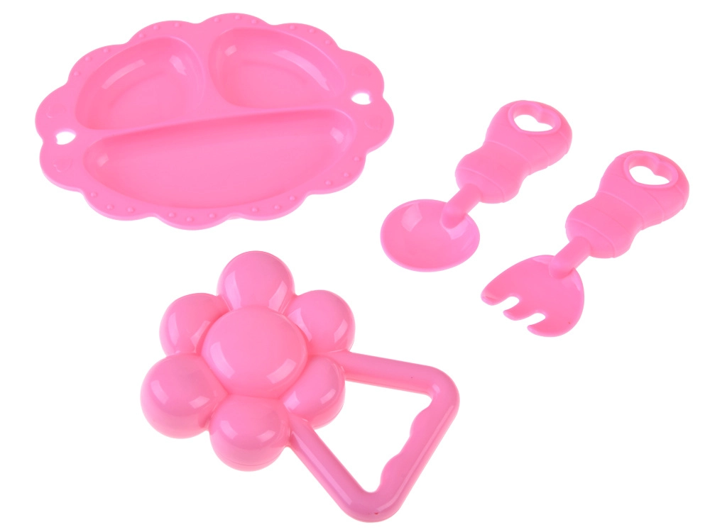 Rožinė lėkštutė, šaukštelis, šakutė ir barškutis skatina vaidmeninius žaidimus, lavina vaizduotę ir smulkiąją motoriką.