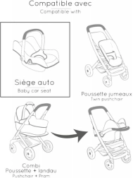 Autokėdutė suderinama su kai kuriomis vežimėlių važiuoklėmis (važiuoklė nėra pakuotėje), todėl tėvų vaidmenų žaidimas tampa dar įdomesnis. Galinis laikymo skyrius talpina smulkius aksesuarus, žinduką ar buteliuką. Tinka lėlėms iki 42 cm.
