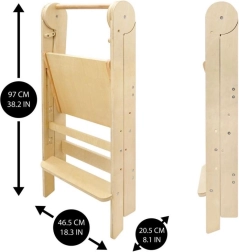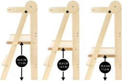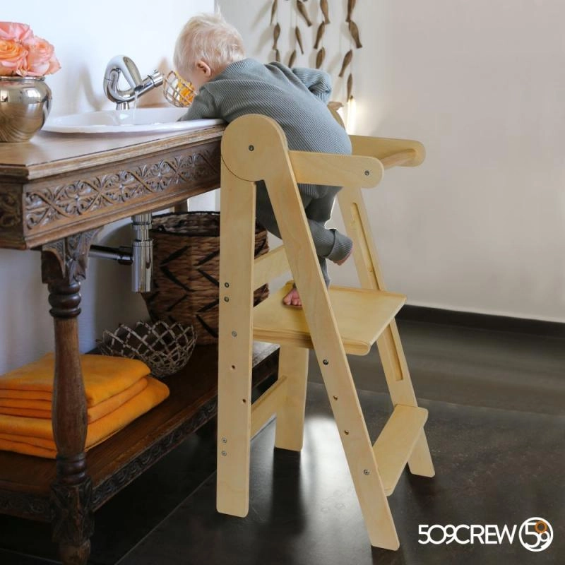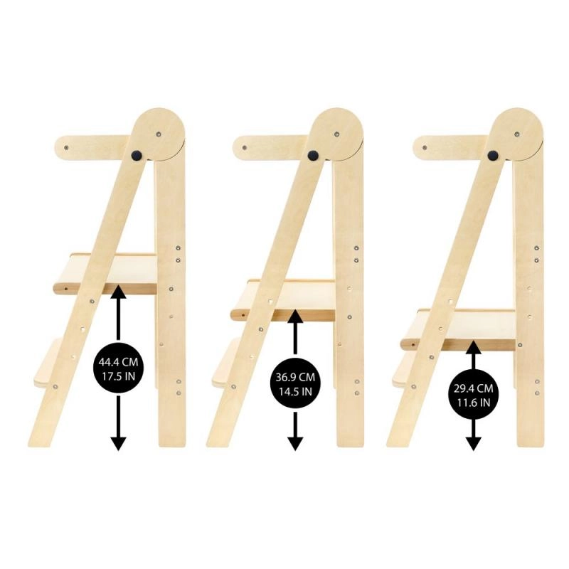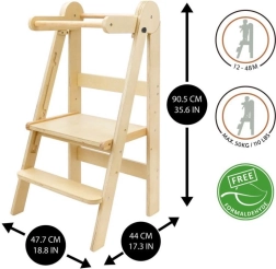 Apgalvintas dizainas leidžia vaikams saugiai ir savarankiškai užlipti dėka 16 cm aukščio laiptelio. Bokštelė yra sulankstoma, ją lengva pernešti iš virtuvės į vonią, o laikant užima minimaliai vietos. Ištestuota mediena neturi formaldehido, tad galite būti tikri dėl sveikatai nekenksmingos medžiagos.