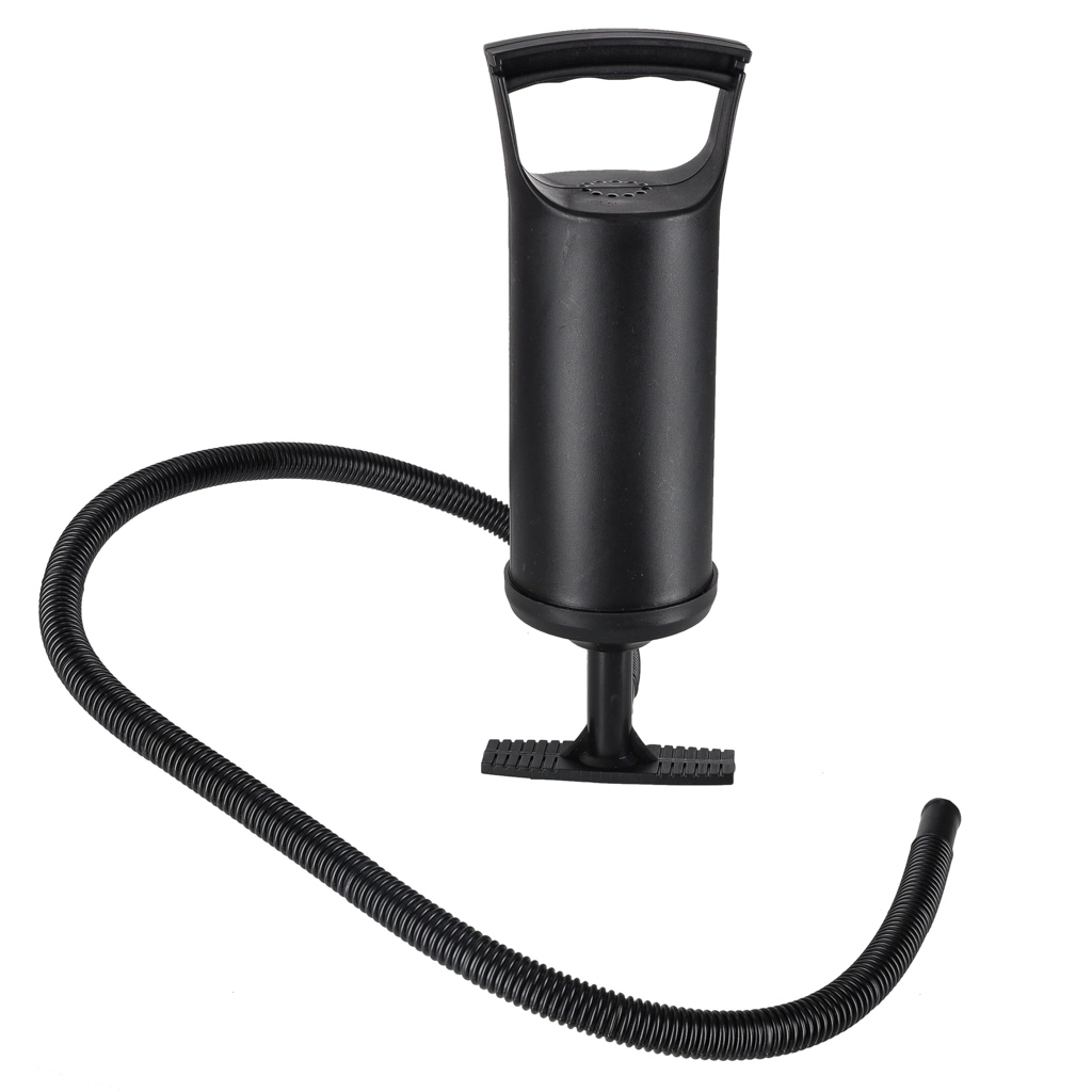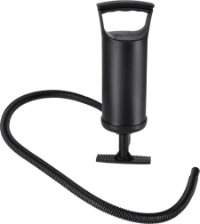 Pakuotėje esanti kompaktiška rankinė pompa su 3 tipų vožtuvais ir lanksčia žarnele leidžia lengvai pripūsti ir išleisti orą namuose, sodyboje ar kempe.