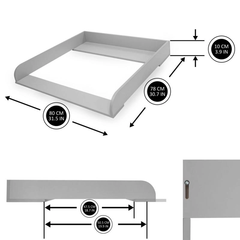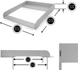 Šis pilkas medinis vystymo pultas pavers jūsų komodą saugia ir ergonomiška vieta kasdienei kūdikio priežiūrai. Dėl slankios priekinės juostos pultą lengvai pritaikysite savo poreikiams – iki 4 cm poslinkis suteikia geresnį pasiekiamumą ir komfortą vystant.