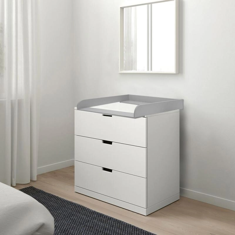 Praktiškas medinis vystymo antstatas elegantiškos pilkos spalvos, skirtas saugiam ir patogiam vystymui. Siūlo lengvą surinkimą ir išardymą, slankią priekinę juostą iki 4 cm ir suderinamumą su IKEA komodomis (Nordli, Malm, Hemnes). Idealiai tinka vietos taupymui ir apgalvotai daiktų organizacijai vaiko kambaryje.
