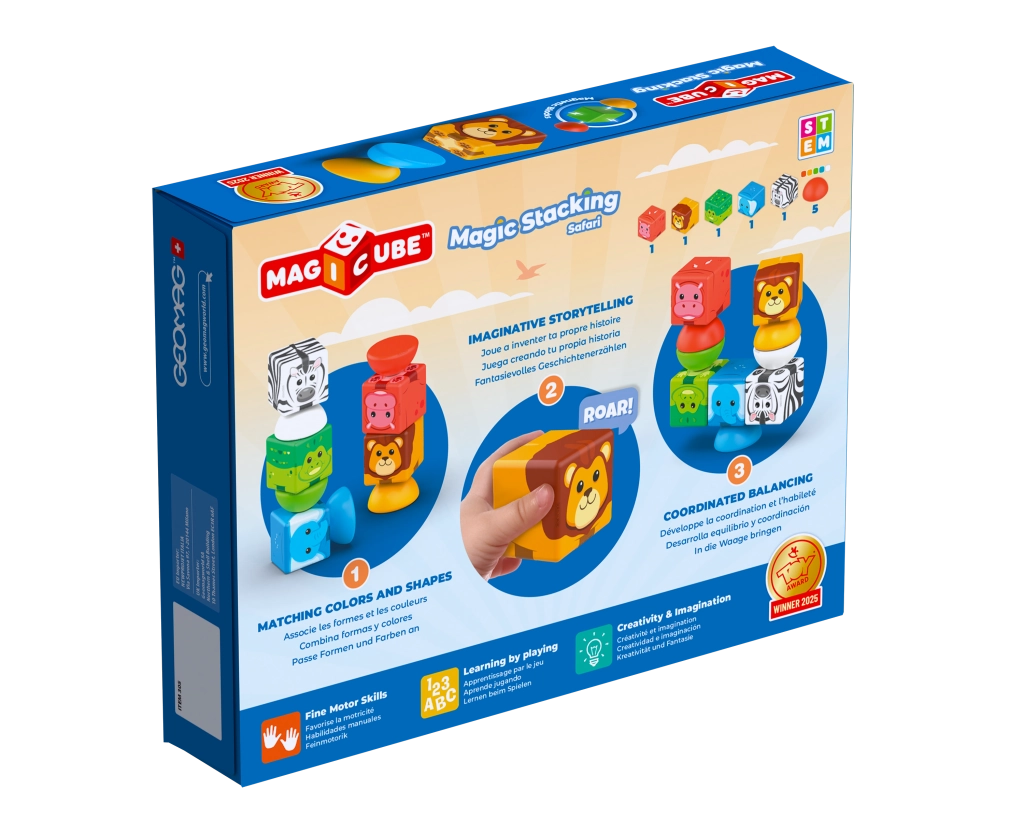 Magnetinė kaladėlių dėlionė Geomag Magicube Safari suteikia vaikams linksmą ir saugų būdą pažinti konstravimo pasaulį. Dėl stiprių magnetų kubeliai ir pusiau sferos lengvai jungiasi iš visų pusių, todėl net mažiausi statytojai gali kurti gyvūnus, mašinėles ir fantazinius formas. Pergalė Niurnbergo žaislų mugėje kategorijoje Baby & Infant 2025 patvirtina jos kokybę ir populiarumą.