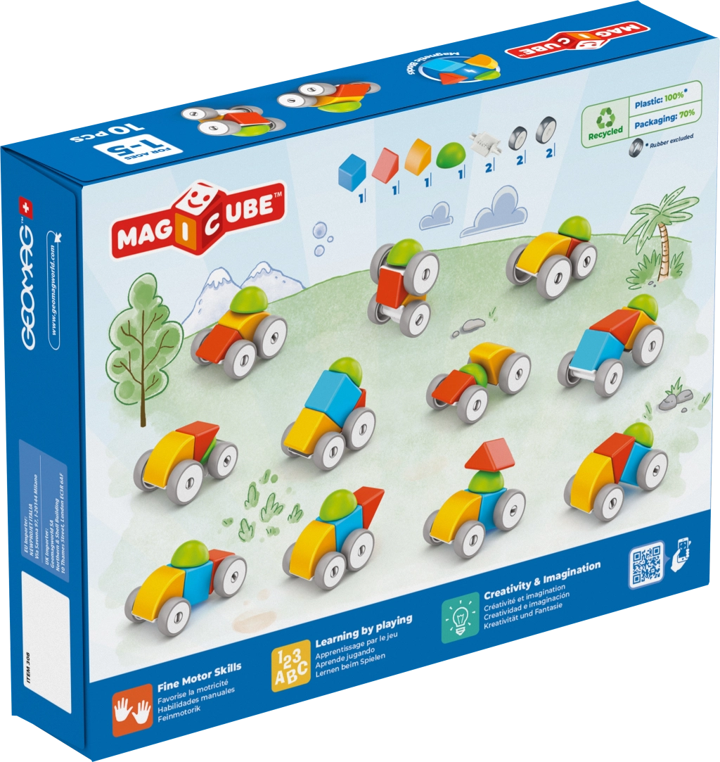 Atraskite kūrybišką pasaulį su magnetine GEOMAG Magicube automobilio rinkiniu, kuriame yra 10 dalių – saugus ir smagus žaislas vaikams jau nuo 1 metų. Dėl magnetinių formų ir ratukų su dviem važiuoklėmis vaikai lengvai susikurs savo pirmąjį automobiliuką, lavins smulkiąją motoriką, vaizduotę ir koordinaciją. Pagaminta Šveicarijoje iš perdirbto plastiko.