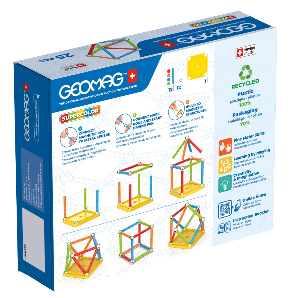 GEOMAG Supercolor rinkinys lavina vaikų fantaziją, loginį mąstymą ir smulkiąją motoriką. Dėl magnetinių sujungimų vaikai gali lengvai kurti įvairias formas, bokštus ir pagrindines geometrines konstrukcijas. Ryškios spalvos ir tvirti plieniniai rutuliukai užtikrina lengvą jungimą ir stabilumą.