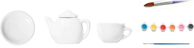 - Visas komplektas: arbatinukas su dangteliu, 2 puodeliai, 2 lėkštutės, 6 spalvos, teptukas