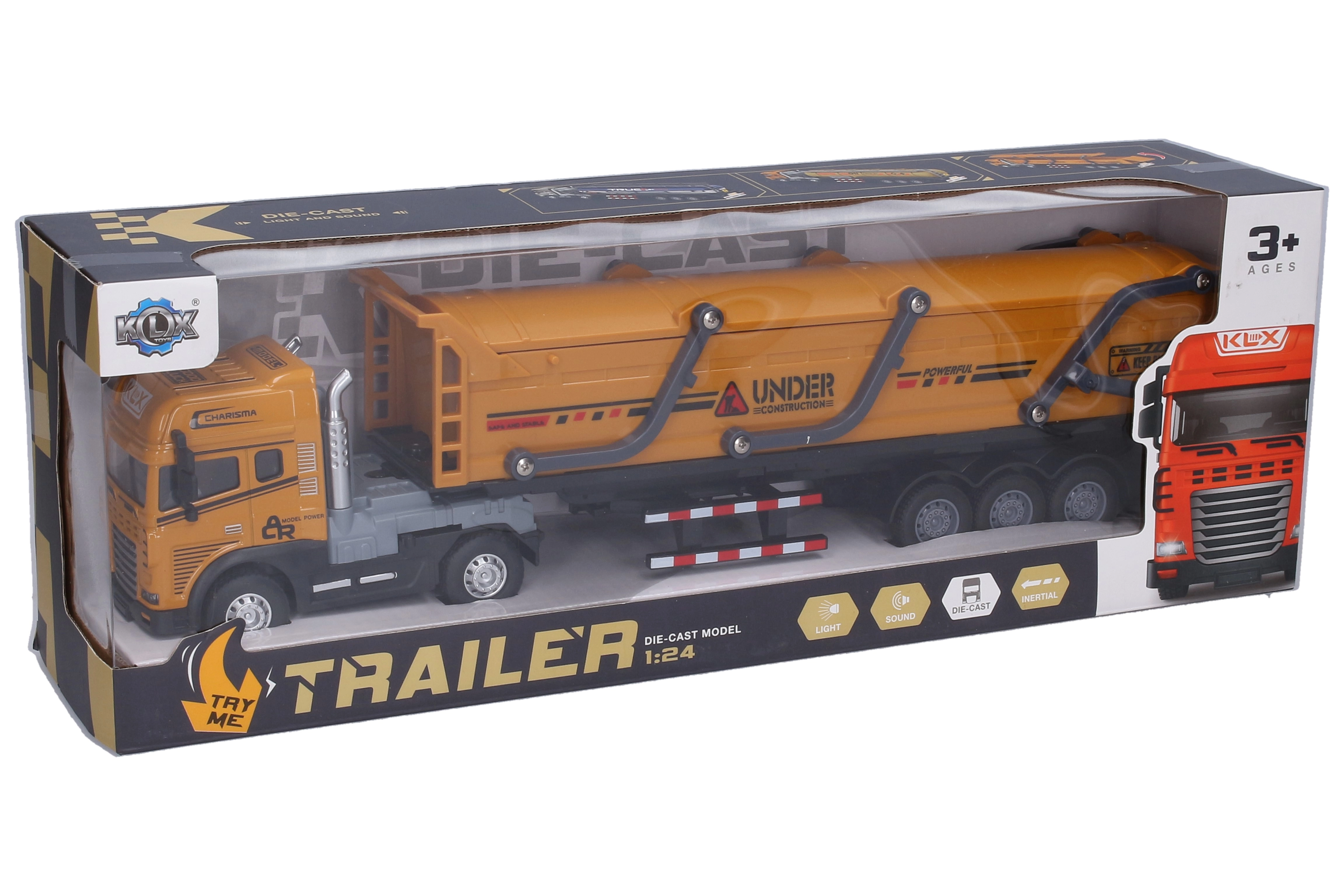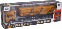 Tvirtas metalinis vilkikas su savivarčio puspriekabe pradžiugins mažus vairuotojus realistišku atlikimu ir funkcijomis. Jis turi inercinį mechanizmą sklandžiam važiavimui, šviesos ir garso efektus su aktyvavimu judinant priekinius ratus ir patogią svirtį puspriekabei užrakinti. Puspriekabę galima lengvai atjungti. Baterijos 3× AG13 yra įtrauktos į pakuotę.