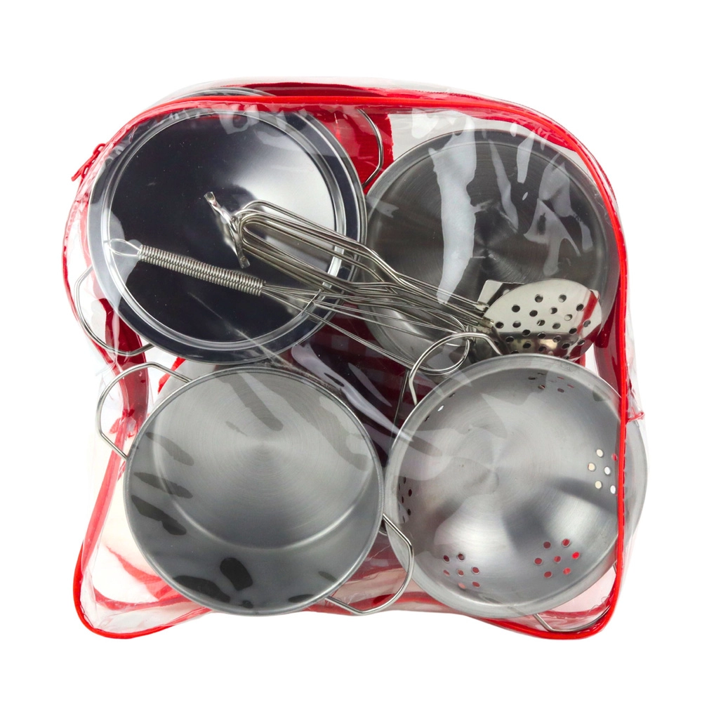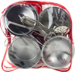 Kokybiškas vaikų metalinių indų rinkinys ištikimai imituoja tikrą virtuvės įrangą – tiek išvaizda, tiek būdingu skambtelėjimu. Viskas tvarkingai sudėta į skaidrią kuprinę su užtrauktuku ir rankena, tad vaikai gali pasiimti savo virtuvės lobius į kiemą, pas draugus ar atostogoms.