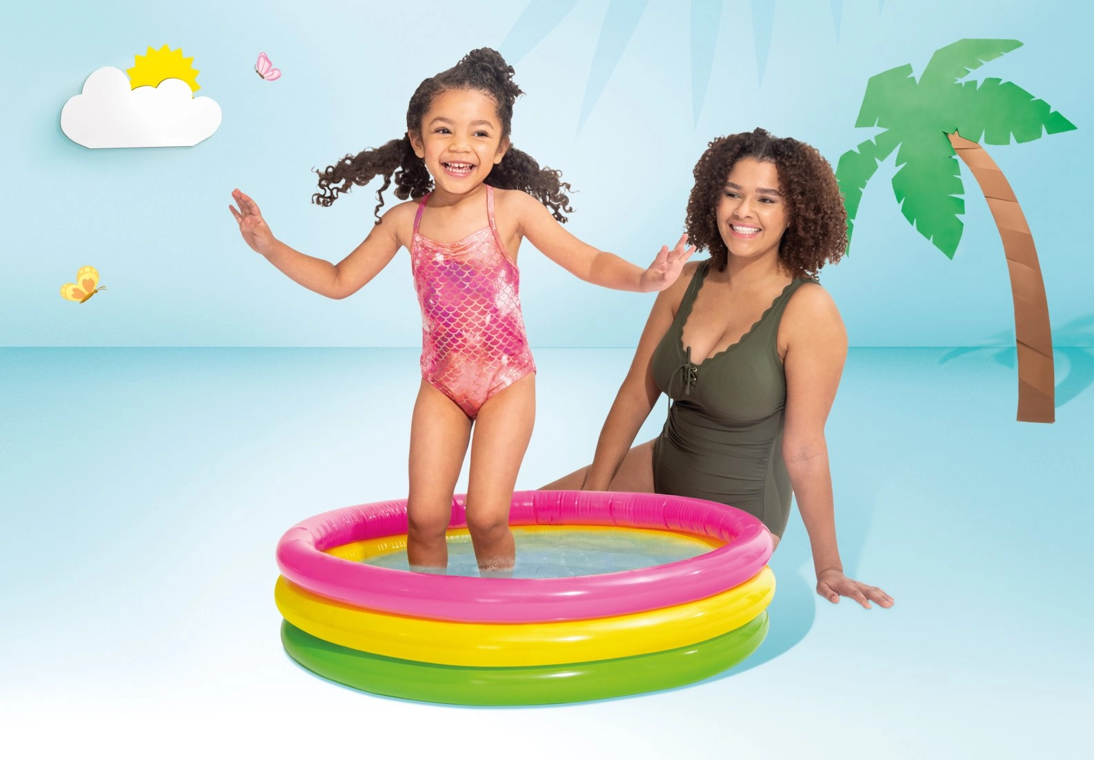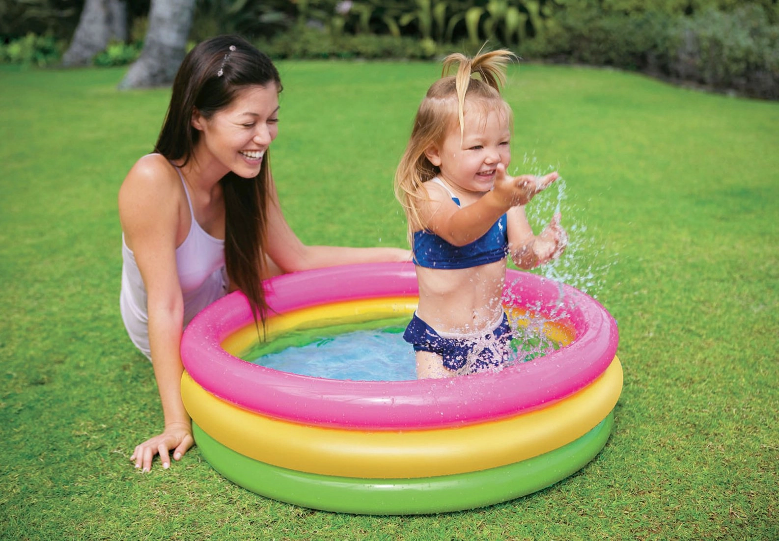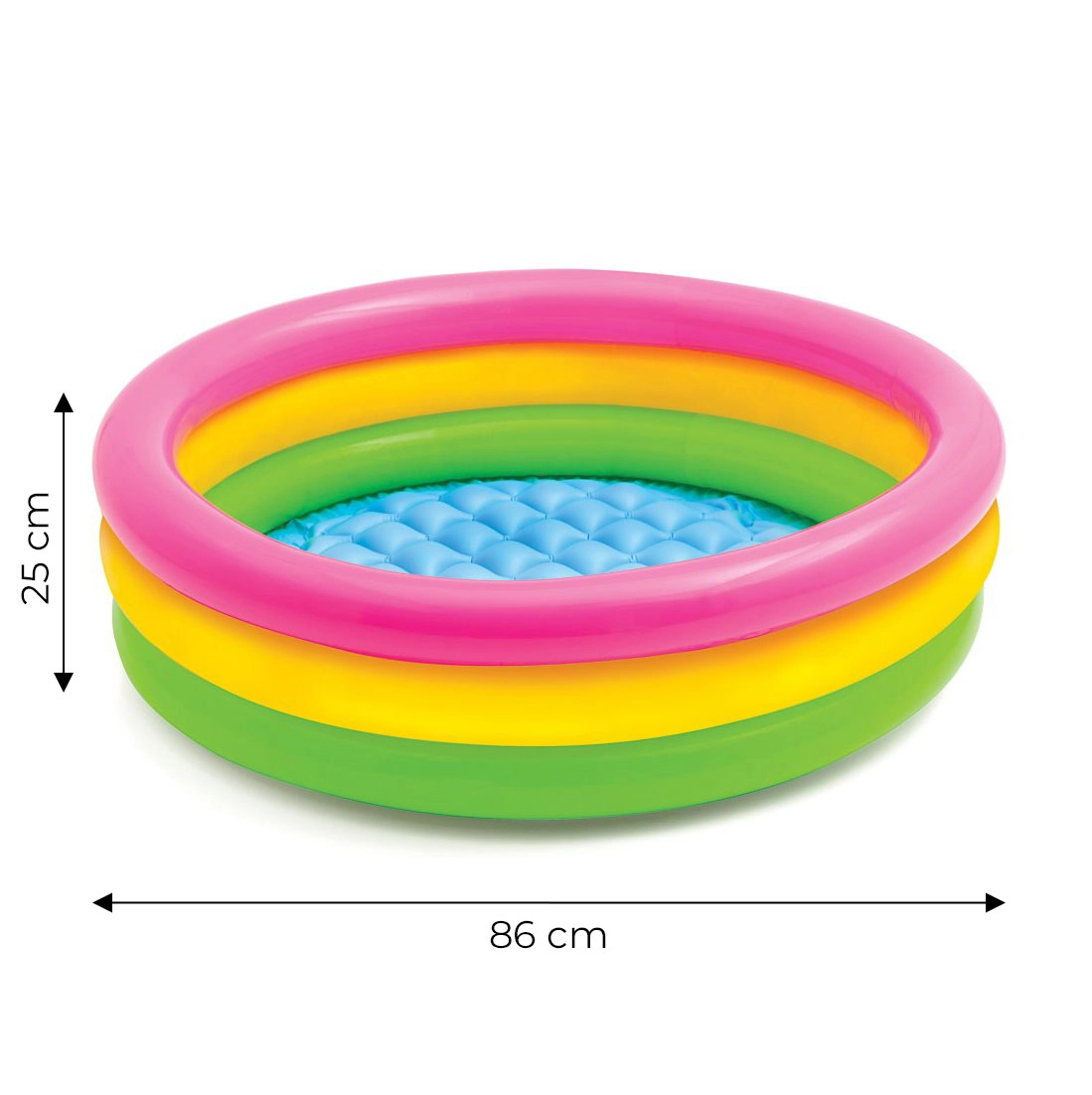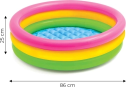 Pripučiamas baseinėlis INTEX suteikia vaikams vandens pramogų džiaugsmą tiesiai jūsų sode. Dėl kompaktiškų matmenų 86 × 25 cm telpa beveik bet kur, o žemas vandens lygis 17 cm didina mažylių saugumo jausmą. Vaivorykštės spalvų dizainas patrauklus ir kviečia žaisti.