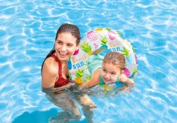 Lengva ir patvari pripučiama INTEX padanga, kurios skersmuo 61 cm, puikiai tinka žaidimams vandenyje ir pirmiesiems plaukimo mokymosi žingsniams. Pagaminta iš tvirto PVC (0,18 mm), su spalvingais motyvais ir patogiu suėmimu. Raštas parenkamas atsitiktinai.