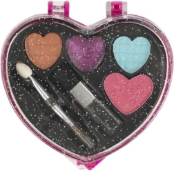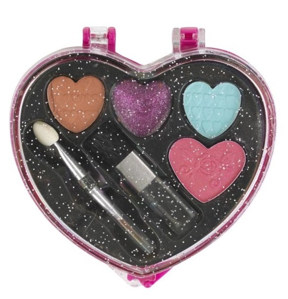 Lūpų blizgesys, akių šešėliai ir skaistalai užsegamame širdelės formos dėkle yra saugūs vaikų odai ir puikiai tinka pirmajam makiažui.