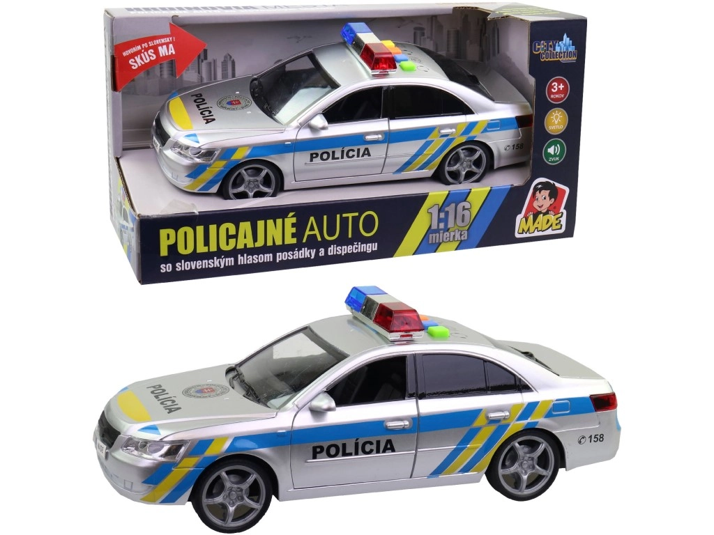 Realistiškas policijos automobilis slovakiško dizaino, su slovakiškomis įgulos ir dispečerio balso frazėmis bei veikiančiu švytinčiu švyturėliu. Siūlo garso efektus, autentiškus pranešimus apie iškvietimus ir kompaktišką dydį, idealų žaidimams namuose ir lauke.