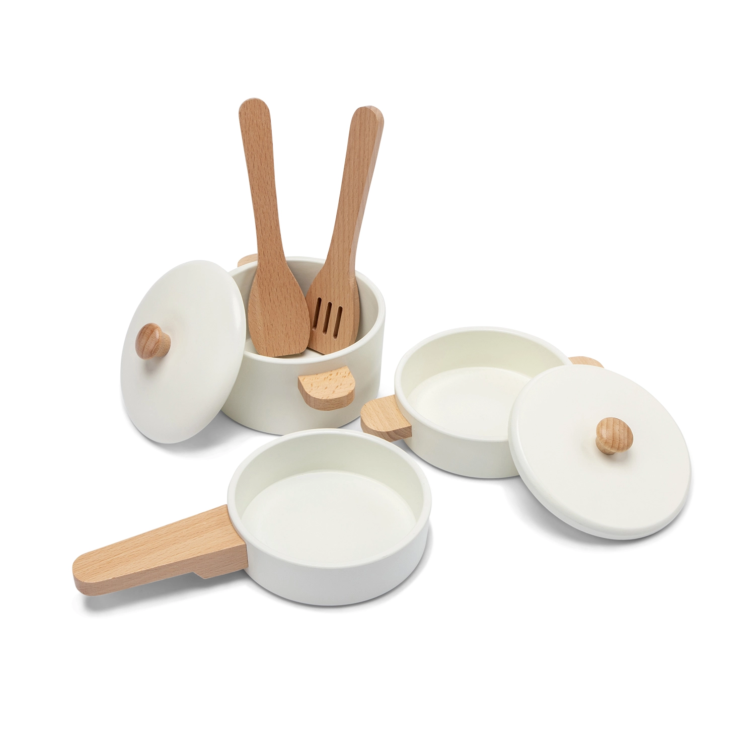 Šis elegantiškas baltos spalvos vaikiškų medinių indų rinkinys yra puikus bet kurios vaikiškos virtuvėlės papildymas. Rinkinyje yra puodas su dangteliu, keptuvės ir mediniai įrankiai – viskas su glotniu paviršiumi ir maloniomis, natūraliomis rankenėlėmis, kad mažoms rankutėms būtų patogu ir saugu suimti.