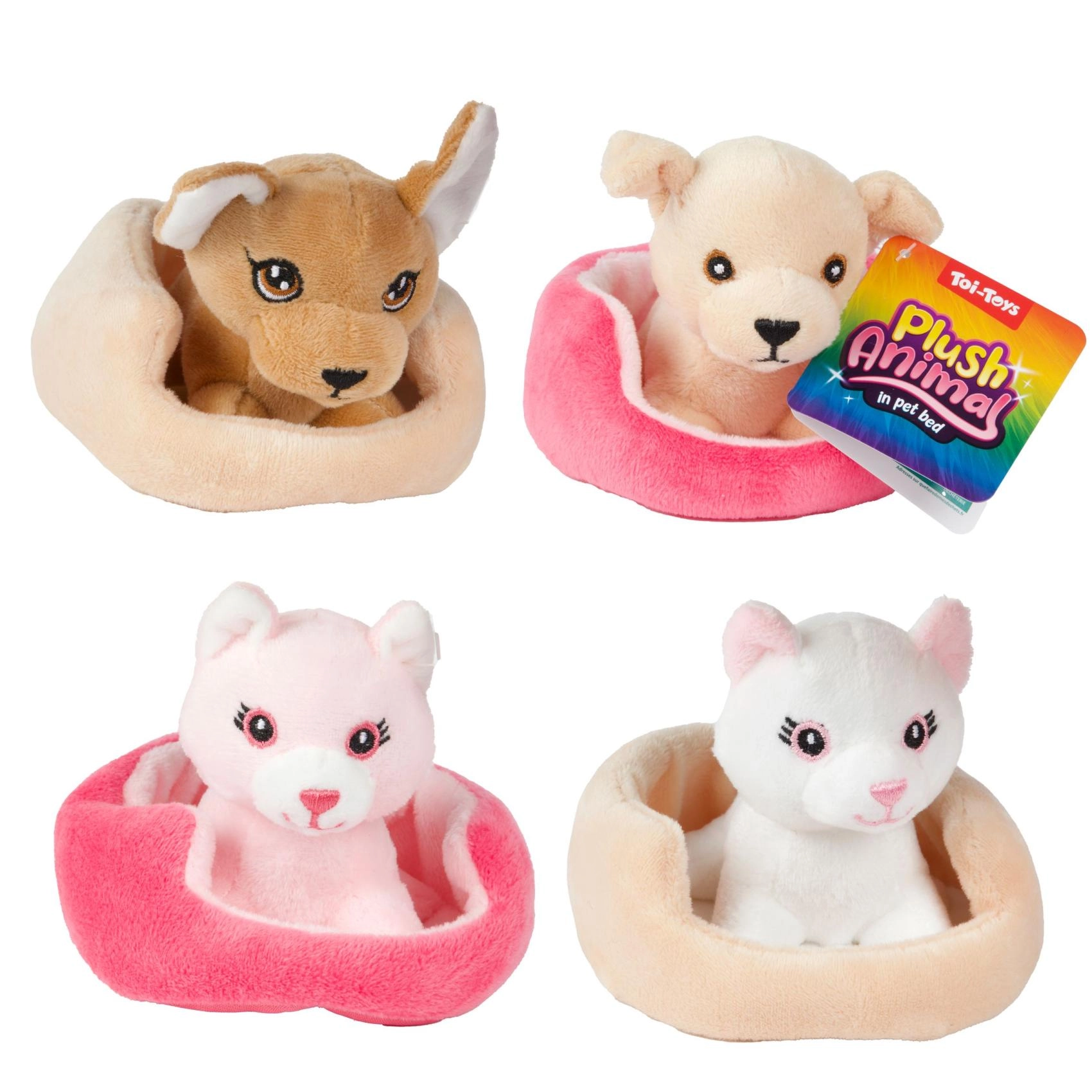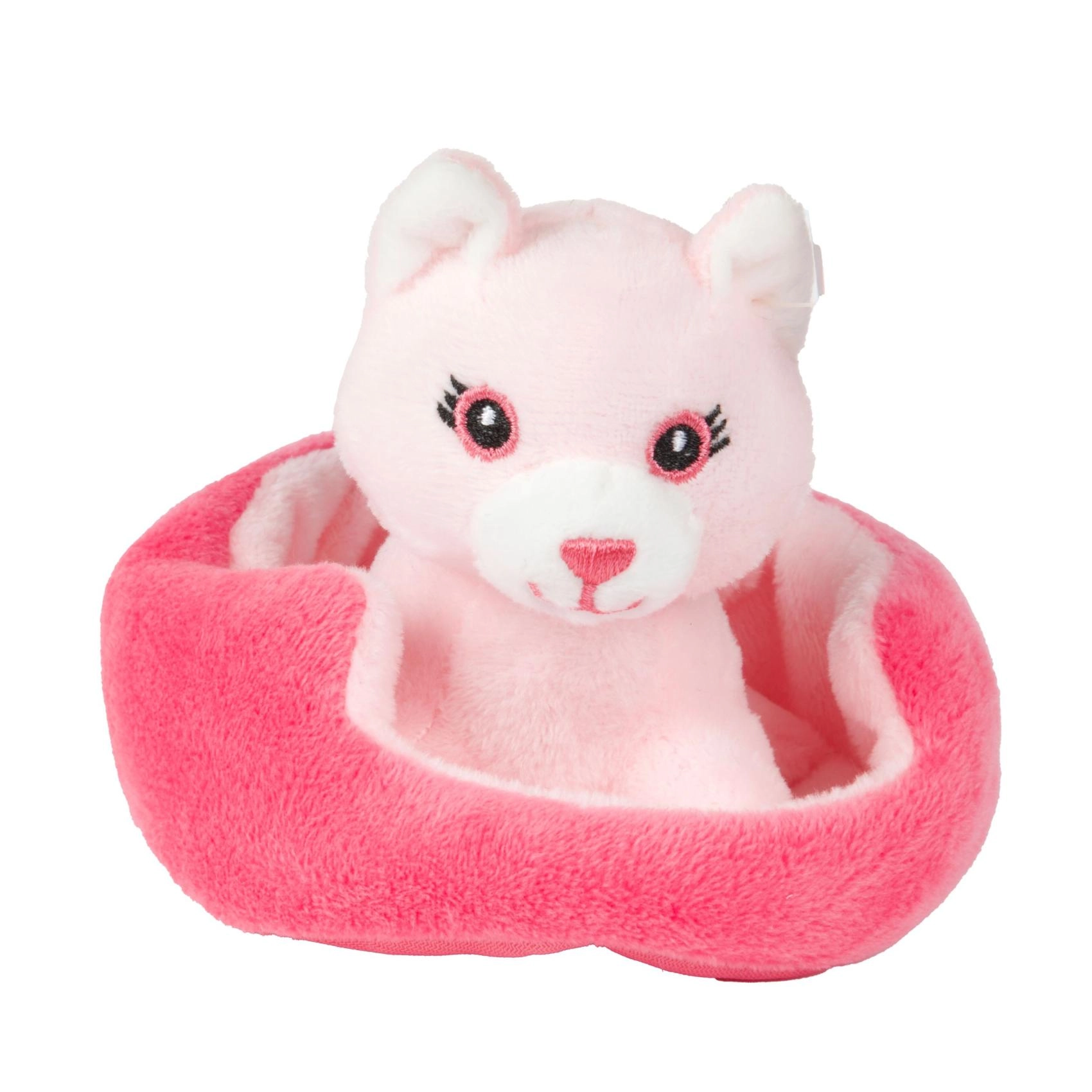 Ši miela pliušinė katytė arba šuniukas jaukiame guolyje – puikus draugas kasdieniams žaidimams ir užmigimui. Dėl minkšto pliušo ir kompaktiško dydžio jį lengva laikyti net pačioms mažiausioms rankytėms, o taip pat skatina fantaziją ir rūpestingus žaidimus.