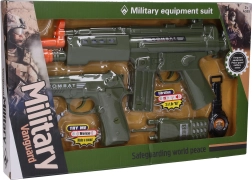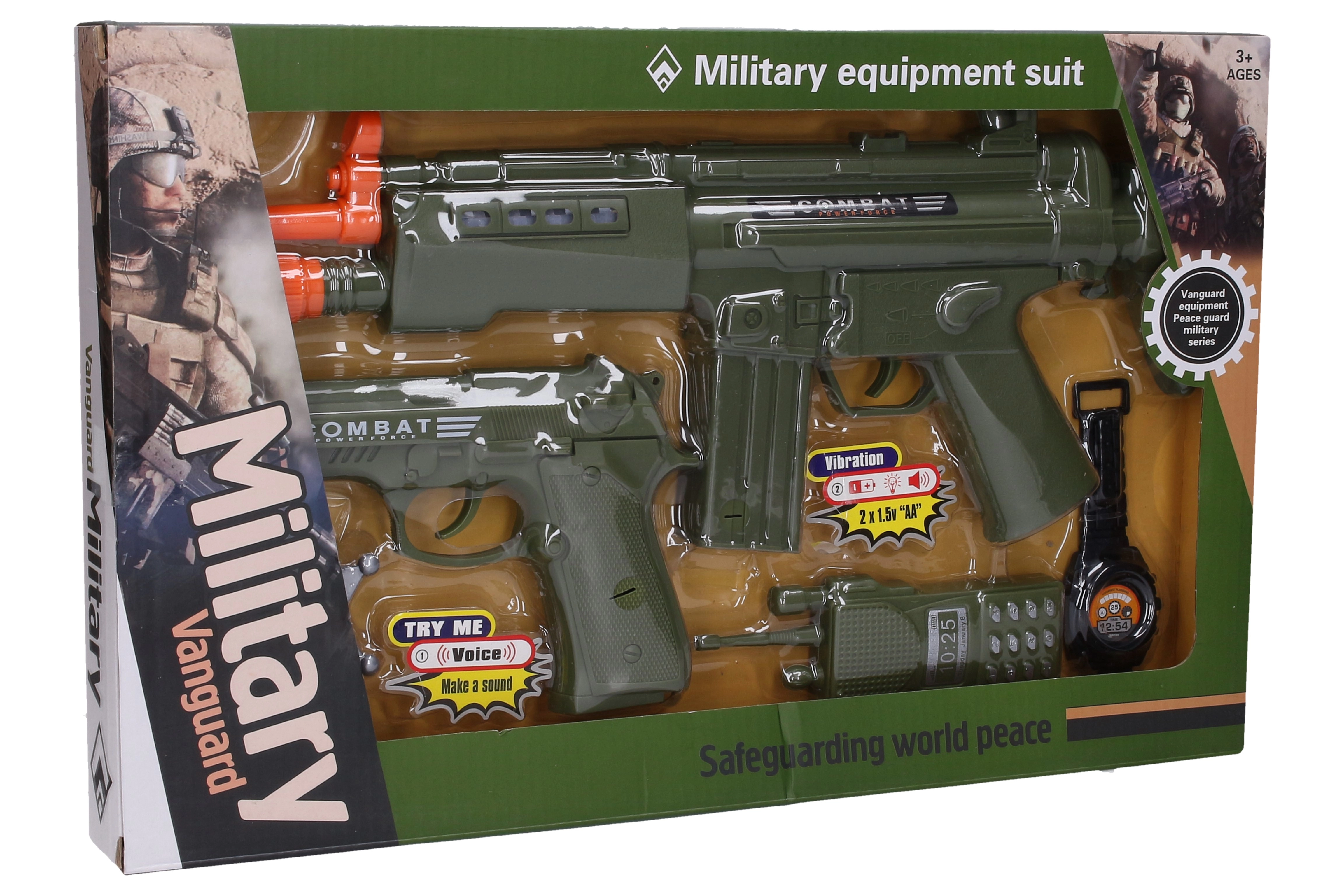 Pilnas karinis rinkinys mažiesiems nuotykių ieškotojams: automatas, pistoletas, ženklelis, racija ir laikrodis. Žaislas skleidžia šviesos ir garso efektus, kurie sustiprina žaidimo įspūdį. Automatas maitinamas 2× AA baterijomis (įtrauktos į pakuotę), todėl vaikai gali pradėti žaisti iš karto.