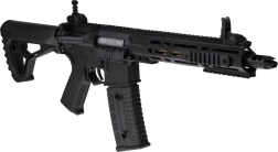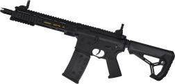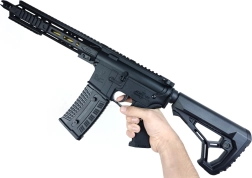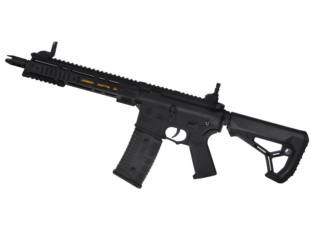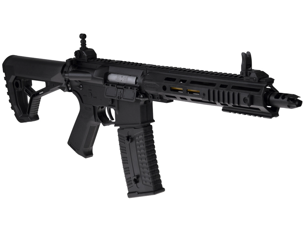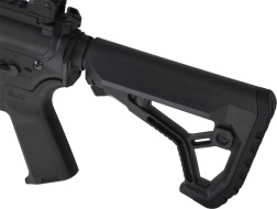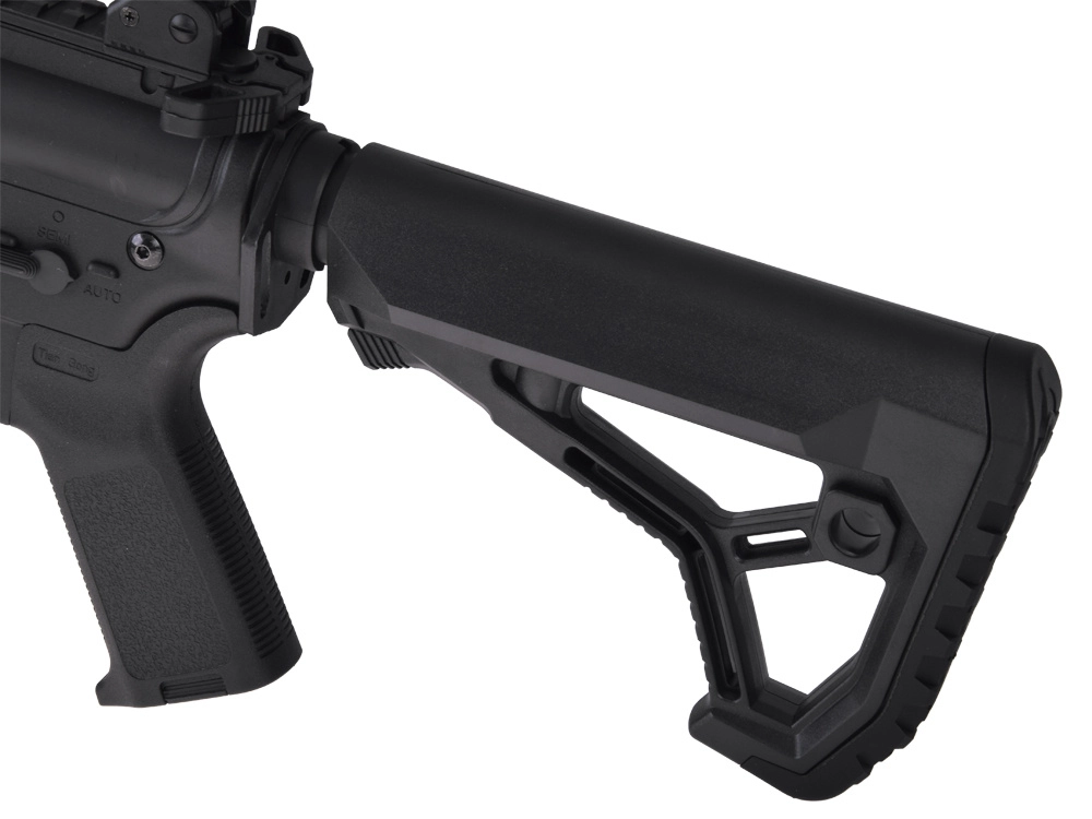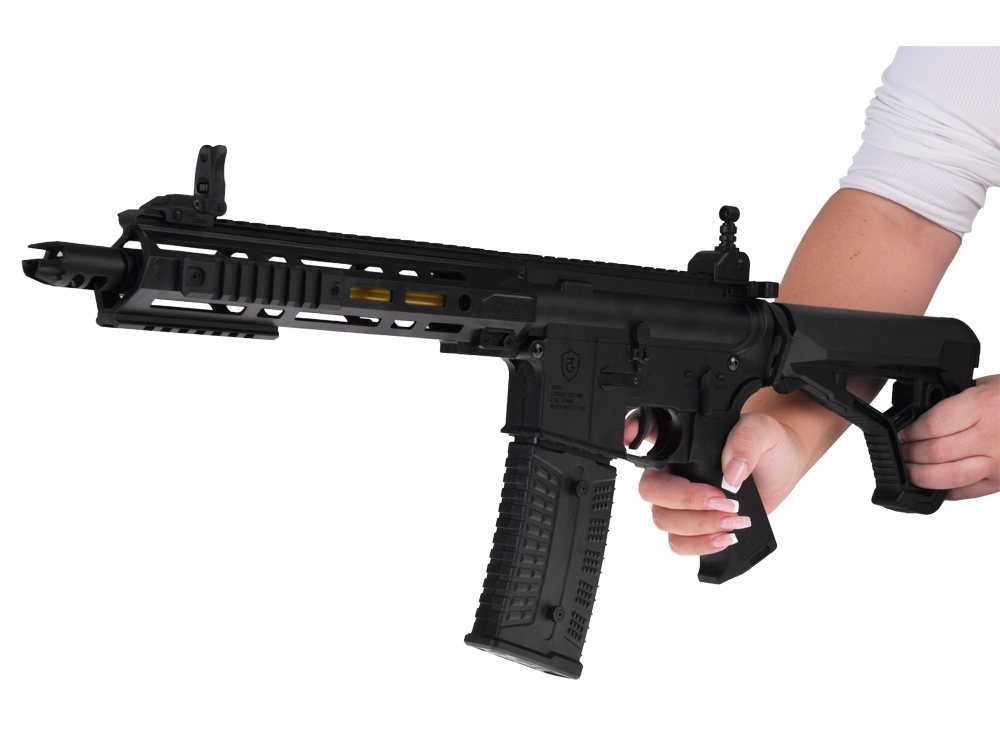 Ilgas priekinis gaubtas su montavimo bėgeliais, nulenkiami taikikliai ir reguliuojamas buožės ilgis sustiprina žaidimo įspūdį ir pagerina laikymo ergonomiką.