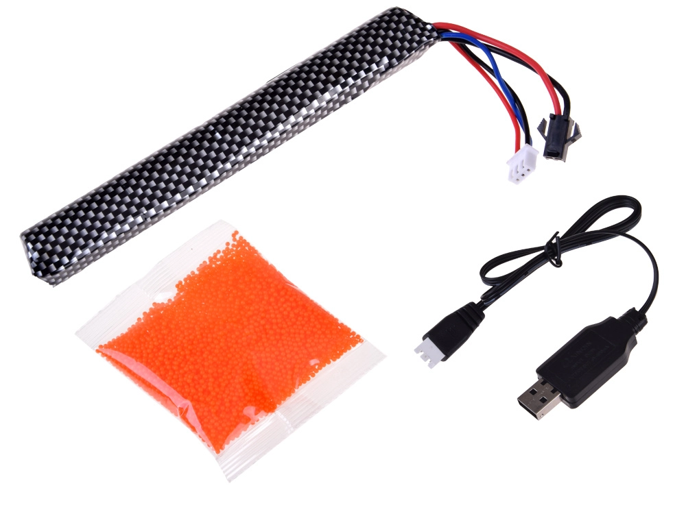 - gelinių kamuoliukų šautuvas F4, dėtuvė, 7,4 V 1200 mAh akumuliatorius, USB laidas, maišelis gelio rutuliukų paruošimui, šešiakampis raktas, duslintuvas (dekoratyvinis), 2× taikikliai, buožė