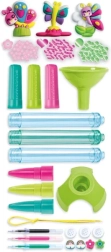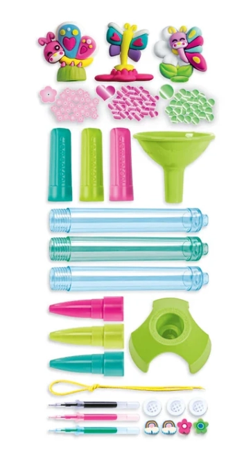 - Plastikinis stovas ir piltuvėlis, 3 skaidrios rašiklių tūbelės, 3 kamšteliai, 3 dangteliai su antgaliais, 3 rašalo užpildai 3 spalvų, 3 maišeliai su įvairių formų ir spalvų papuošimais, 8 plastikiniai karoliukai, elastinga virvelė, 3 gumos figūrėlės, instrukcija