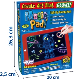 Magiškas WOOPIE piešimo planšetas paverčia vaikų piešinius į šviečiančius neoninius kūrinius. Dėl LED apšvietimo su 8 efektais, nuvalomo paviršiaus ir neoninių flomasterių piešimas, raidžių mokymasis ir skaičiavimas yra švarūs, smagūs ir maksimaliai kūrybiški.