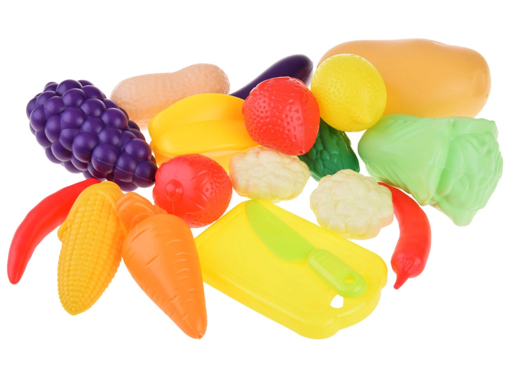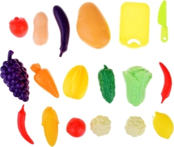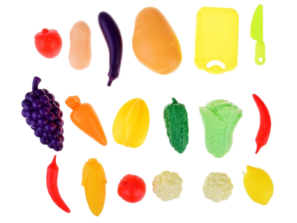 Įvairios formos ir spalvos skatina vaizduotę, maisto produktų pavadinimų mokymąsi bei pardavėjo ar pirkėjo vaidmenis.