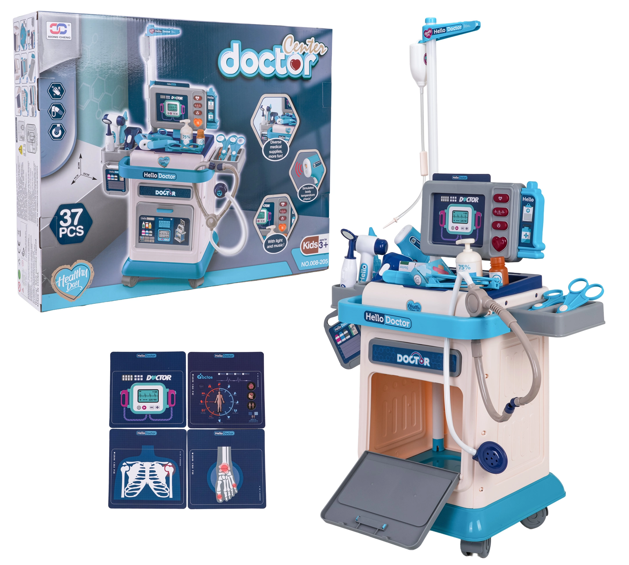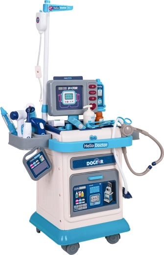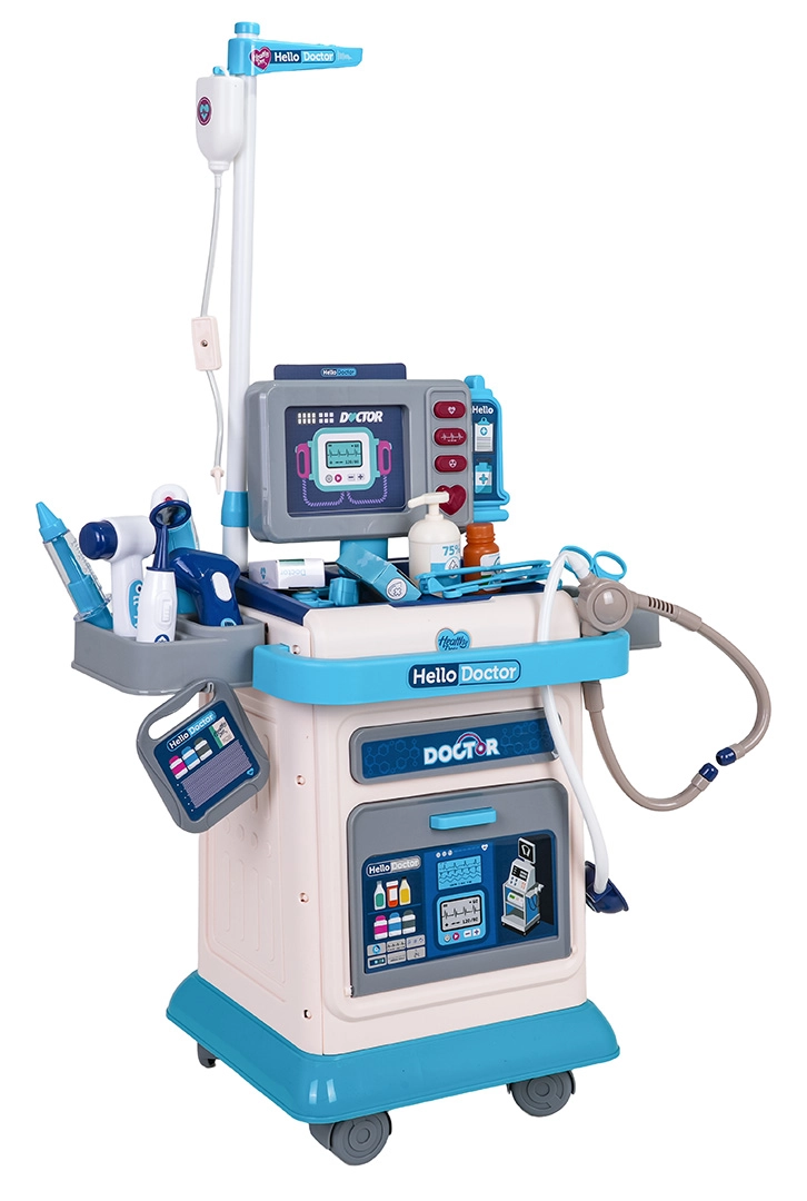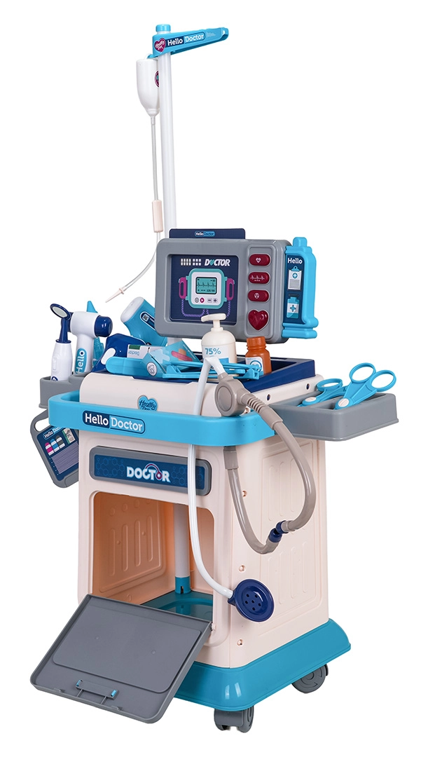 Šis gausiai aprūpintas medicininis rinkinys vaikams suteikia smagų ir lavinantį gydytojo žaidimą. Stabilus vežimėlis su ratukais ir reguliuojamu ranktūriu palengvina visos „ordinacijos“ pervežimą, o monitoriaus skydelis siūlo šviesos ir garso efektus – širdies plakimą, temperatūros matavimą, tomografo garsą ir signalą. Komplekte yra keičiami vaizdai EKG ir tomografui, kurie sustiprina realistišką patirtį.