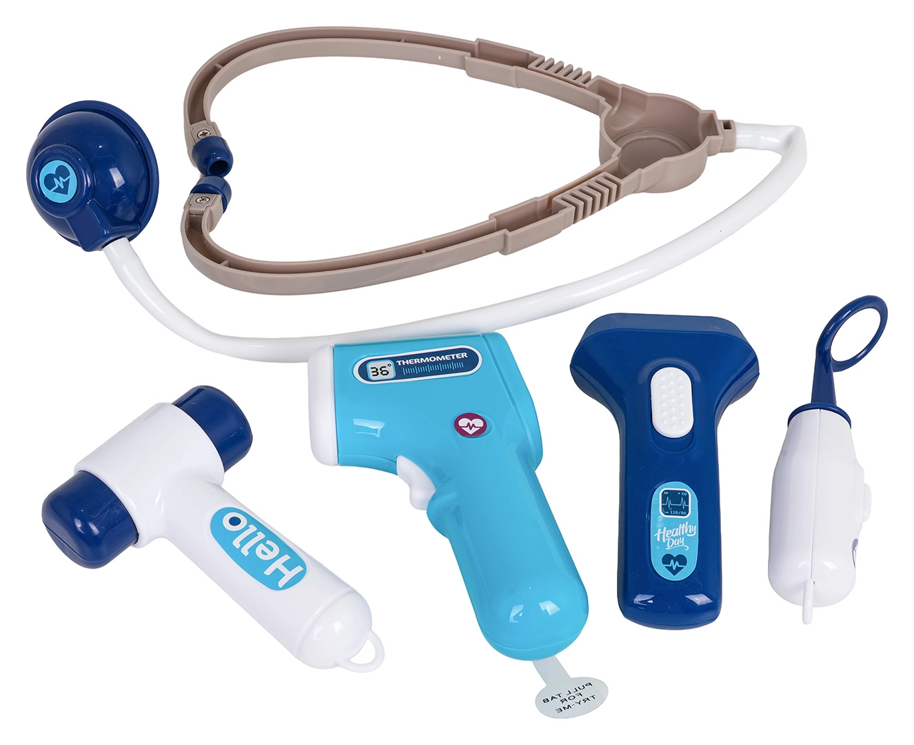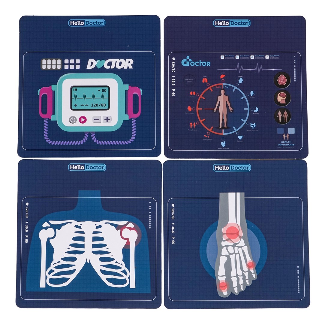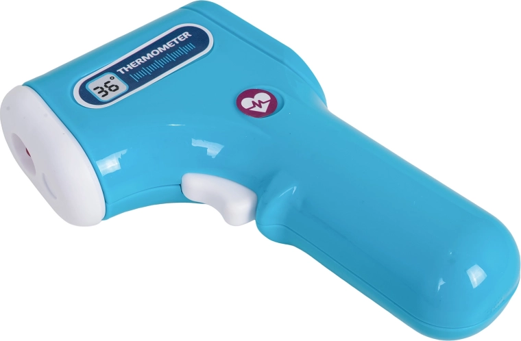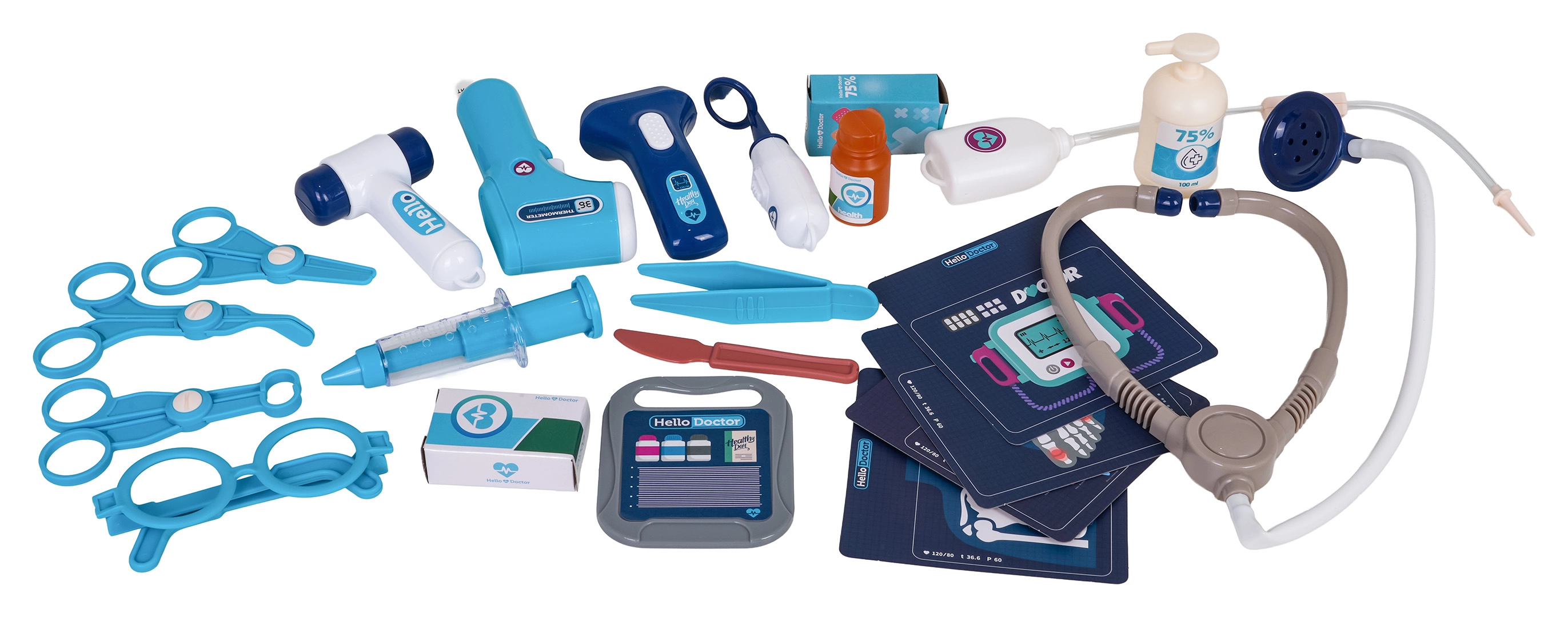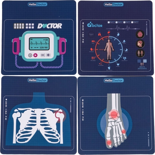 Stetoskopas, bekontaktis termometras su šviesa, švirkštas, žirklės, pincetas, veidrodėlis, plaktukas, akiniai, paciento kortelė ir kiti priedai kūrybiškam žaidimui.