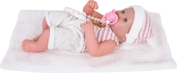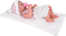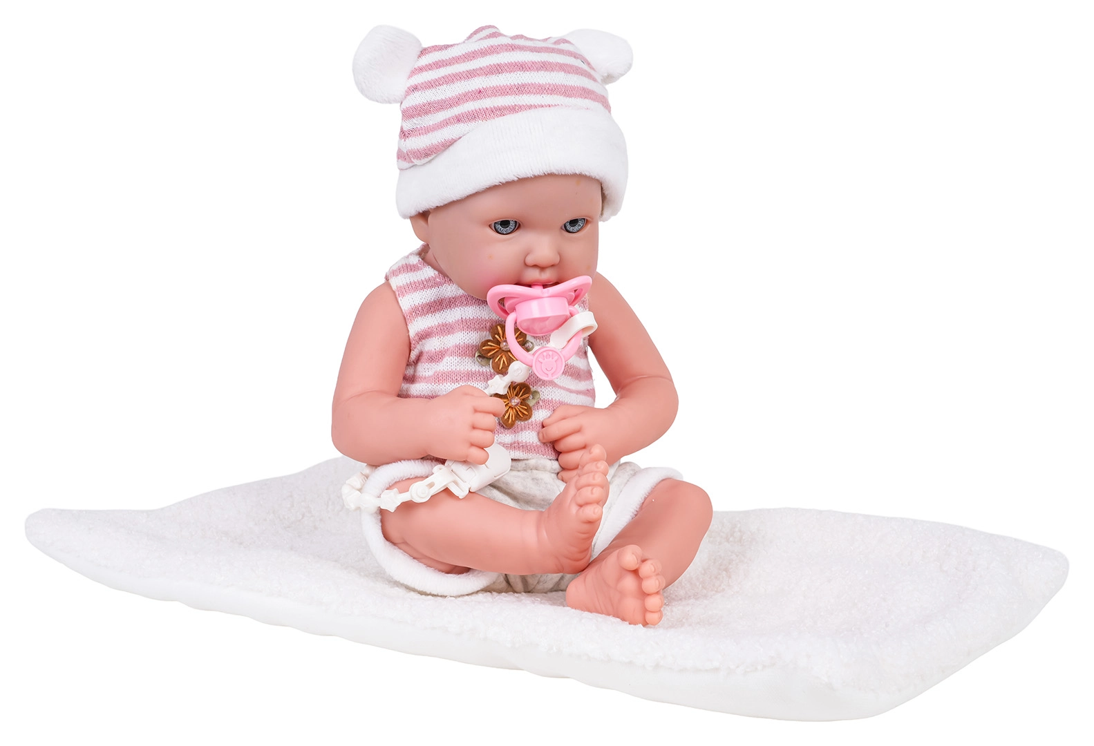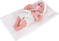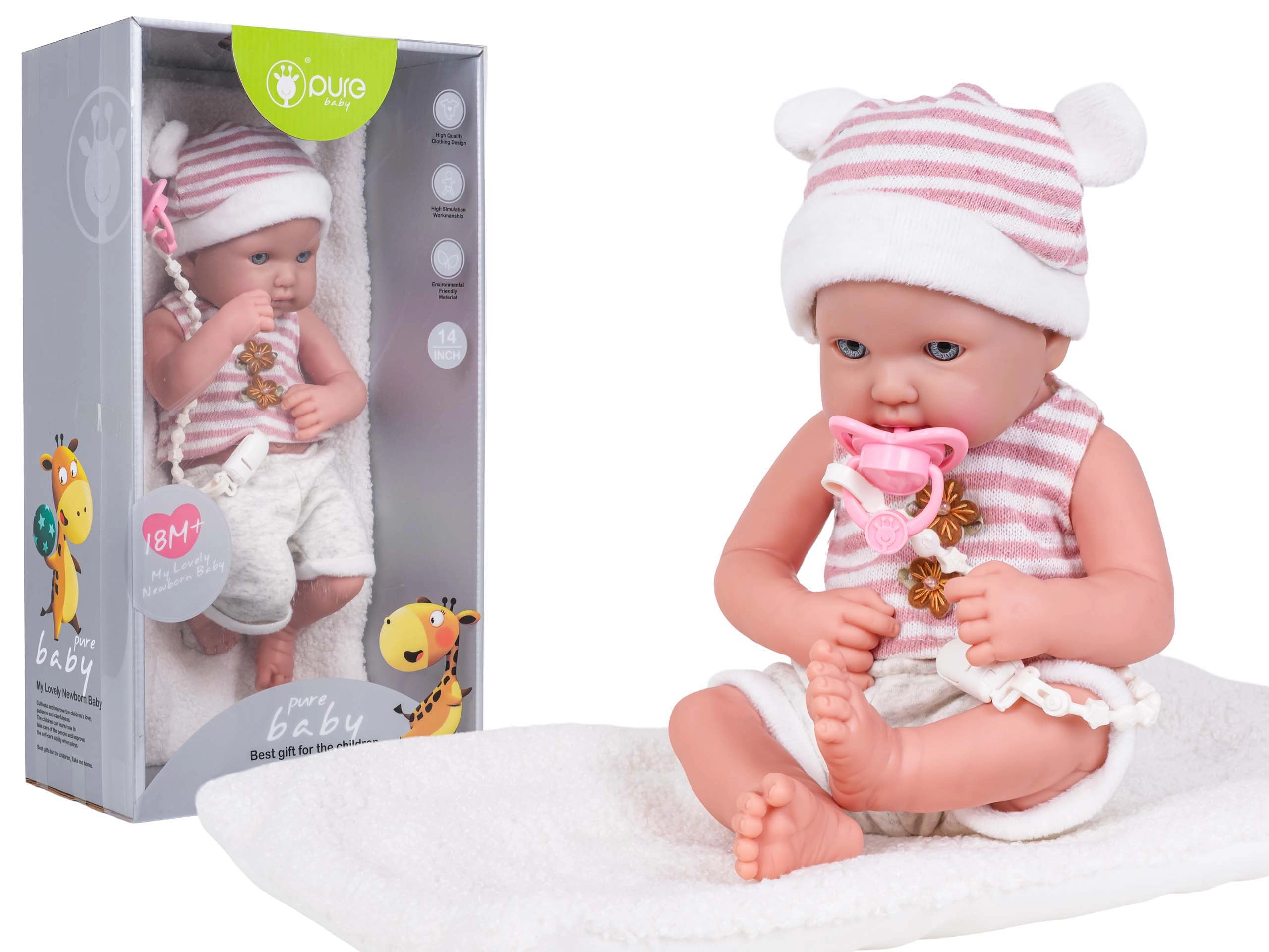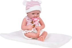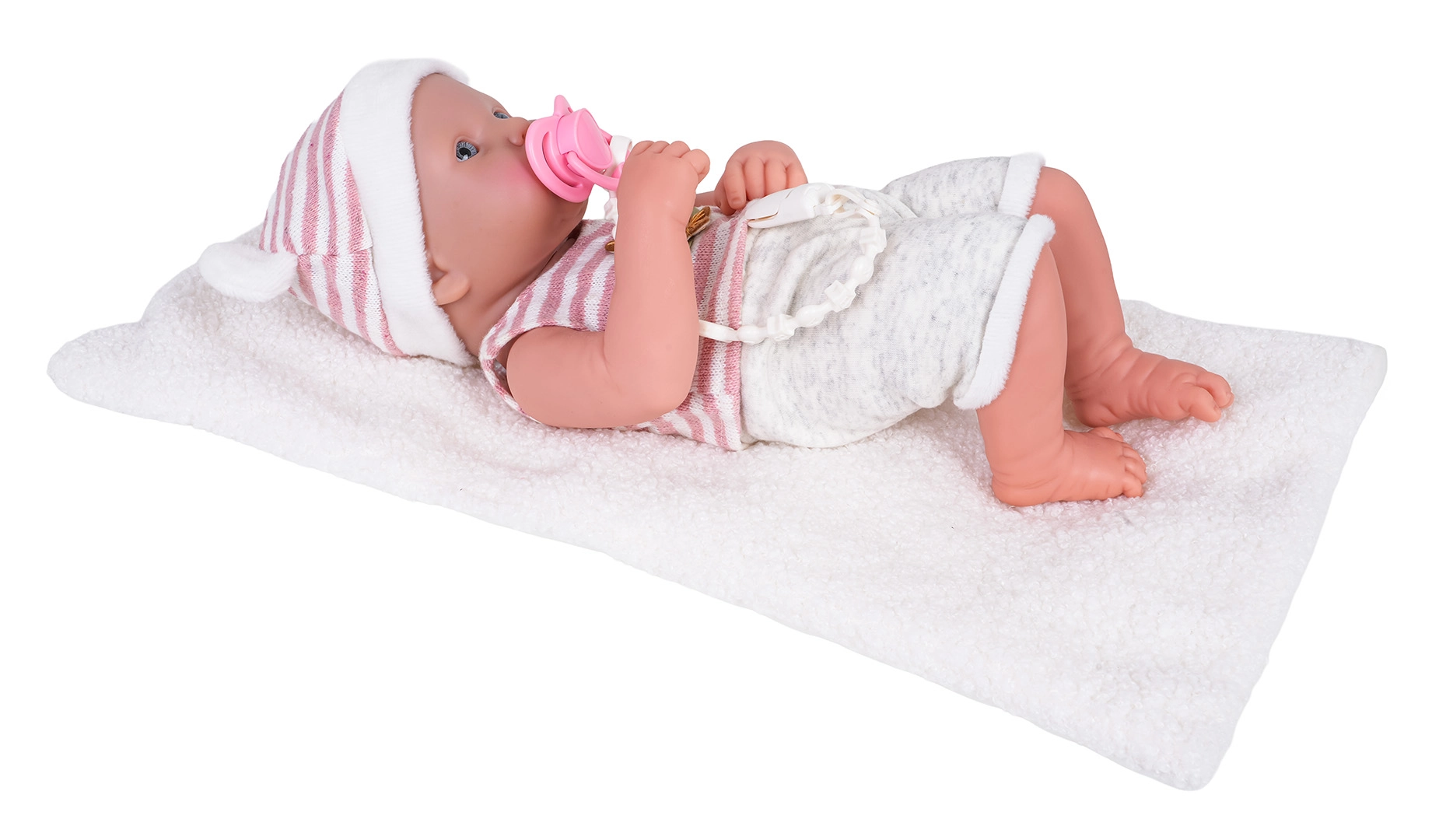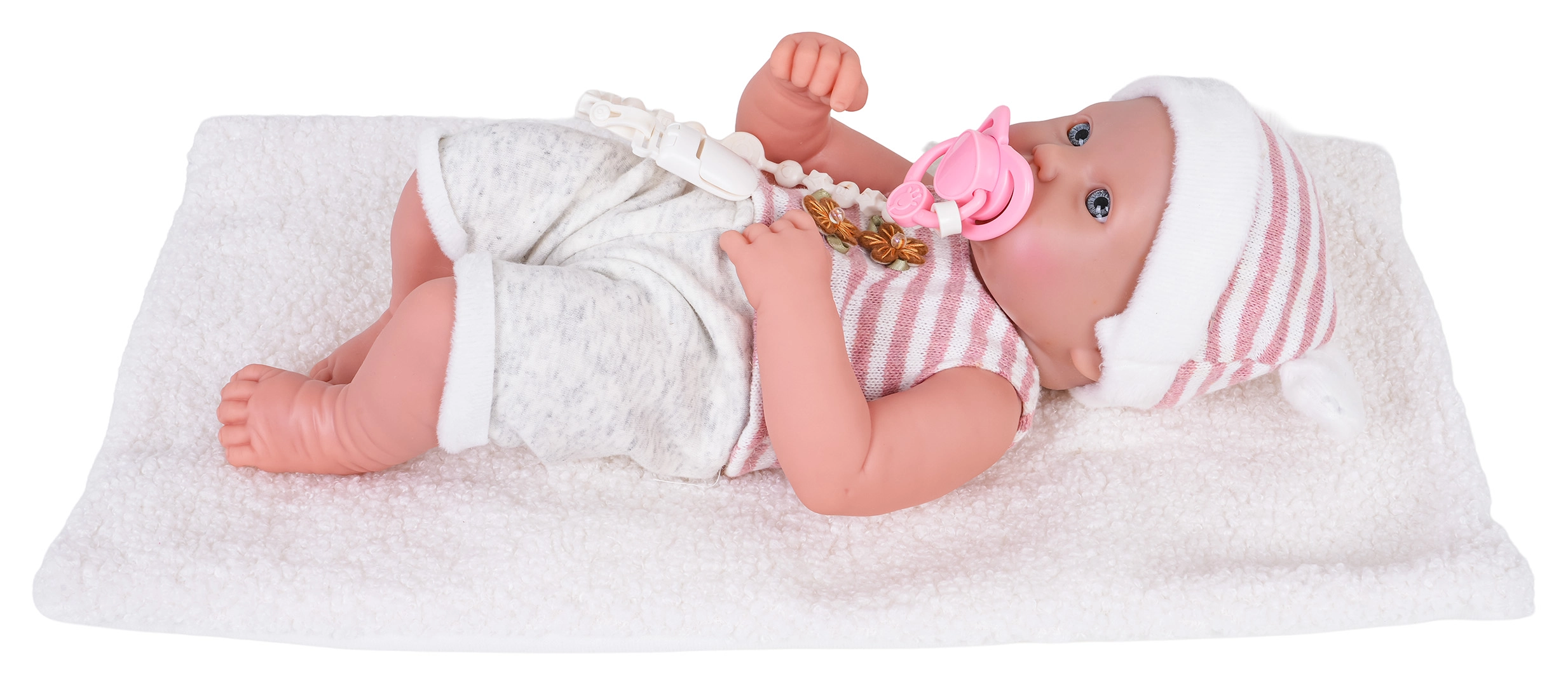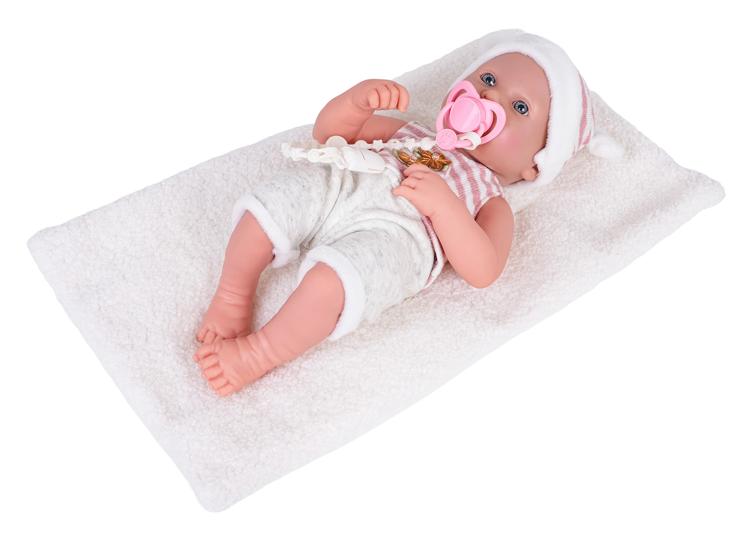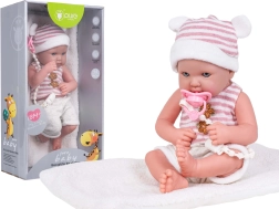 Pakuotėje rasite viską, ko vaikams reikia žaidžiant: čiulptuką su virvele kūdikiui nuraminti ir minkštą apklotėlį pervystymui ar migdymui. Lėlė tinkama nuo 3 metų, vilki lengvai nuvelkamus drabužėlius (kepurytę, viršutinę dalį ir šortukus) ir yra paprasta prižiūrėti.