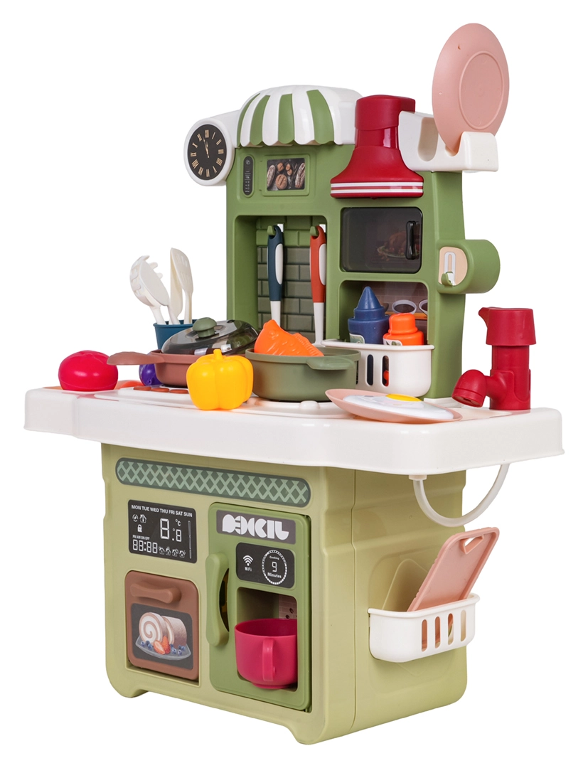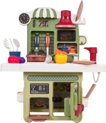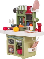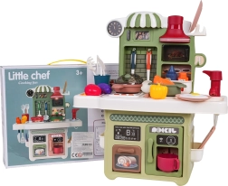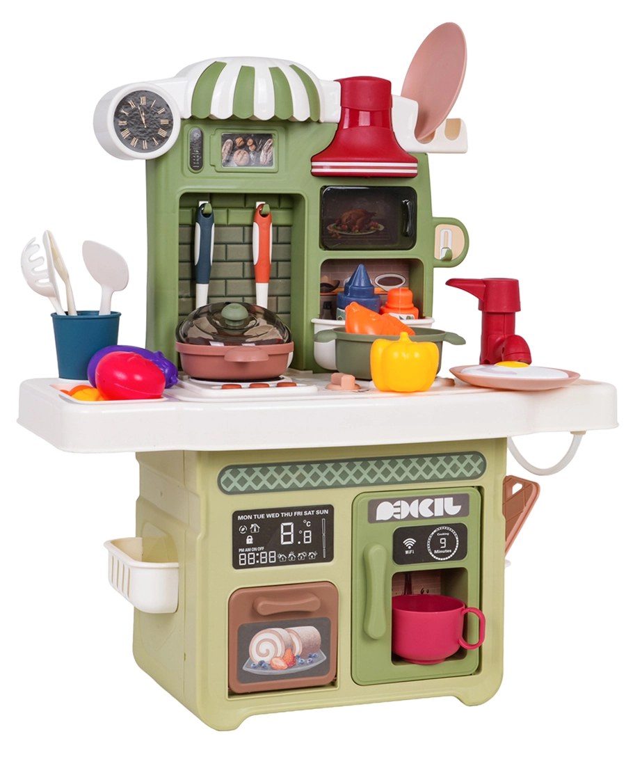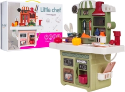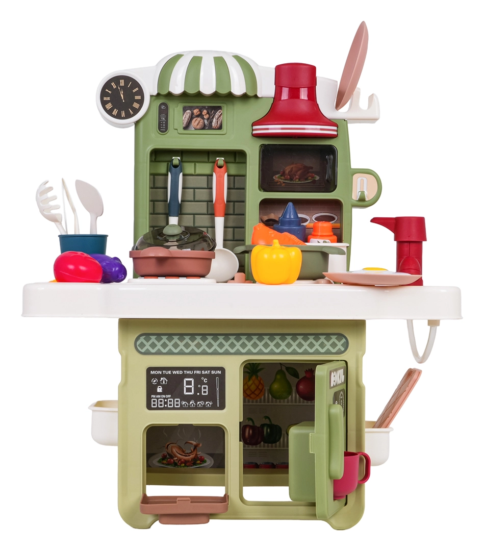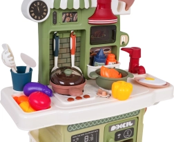 Rinkinį papildo veikiantis čiaupas su cirkuliuojančiu vandeniu (su pompute), tad vaikai gali „plauti“ indus kaip tikroje virtuvėje. Yra ir kavos aparato maketas, apšviestas gartraukis bei atsidaranti orkaitė. Daug priedų – puodai, keptuvės, lėkštutės, įrankiai ir maisto produktai – praplečia žaidimo galimybes.