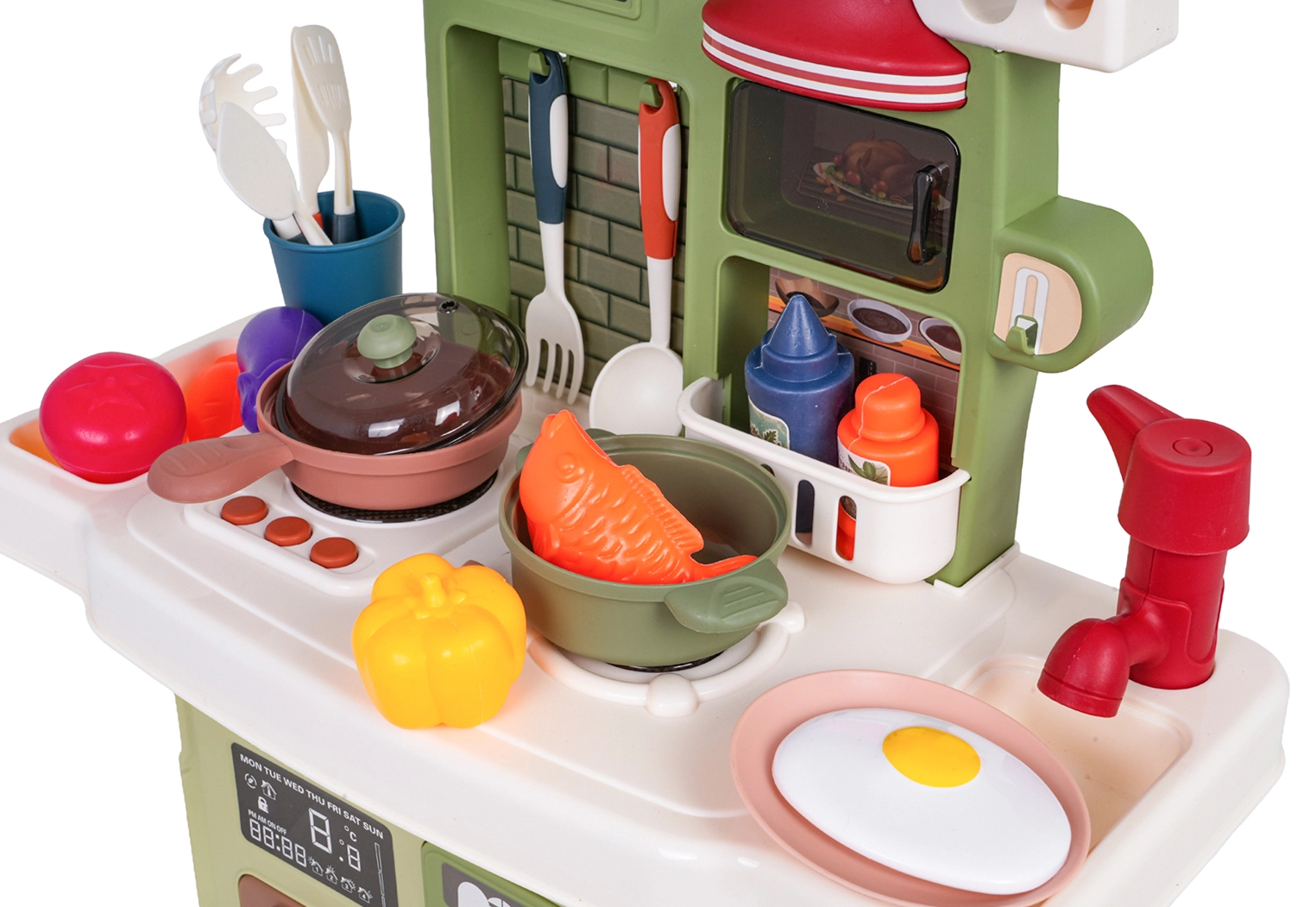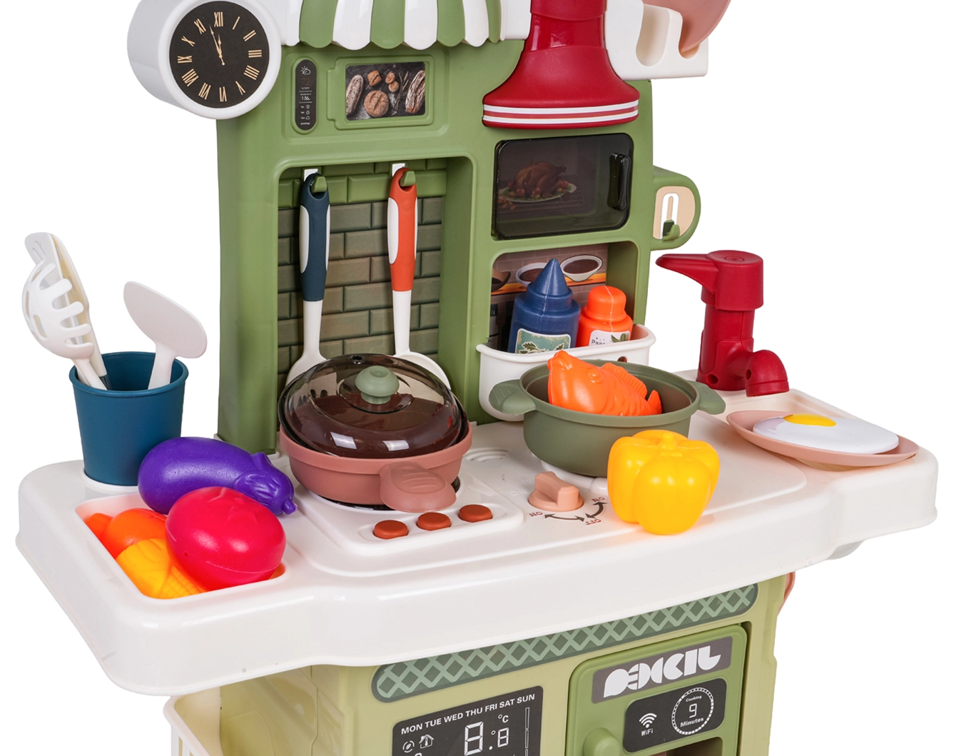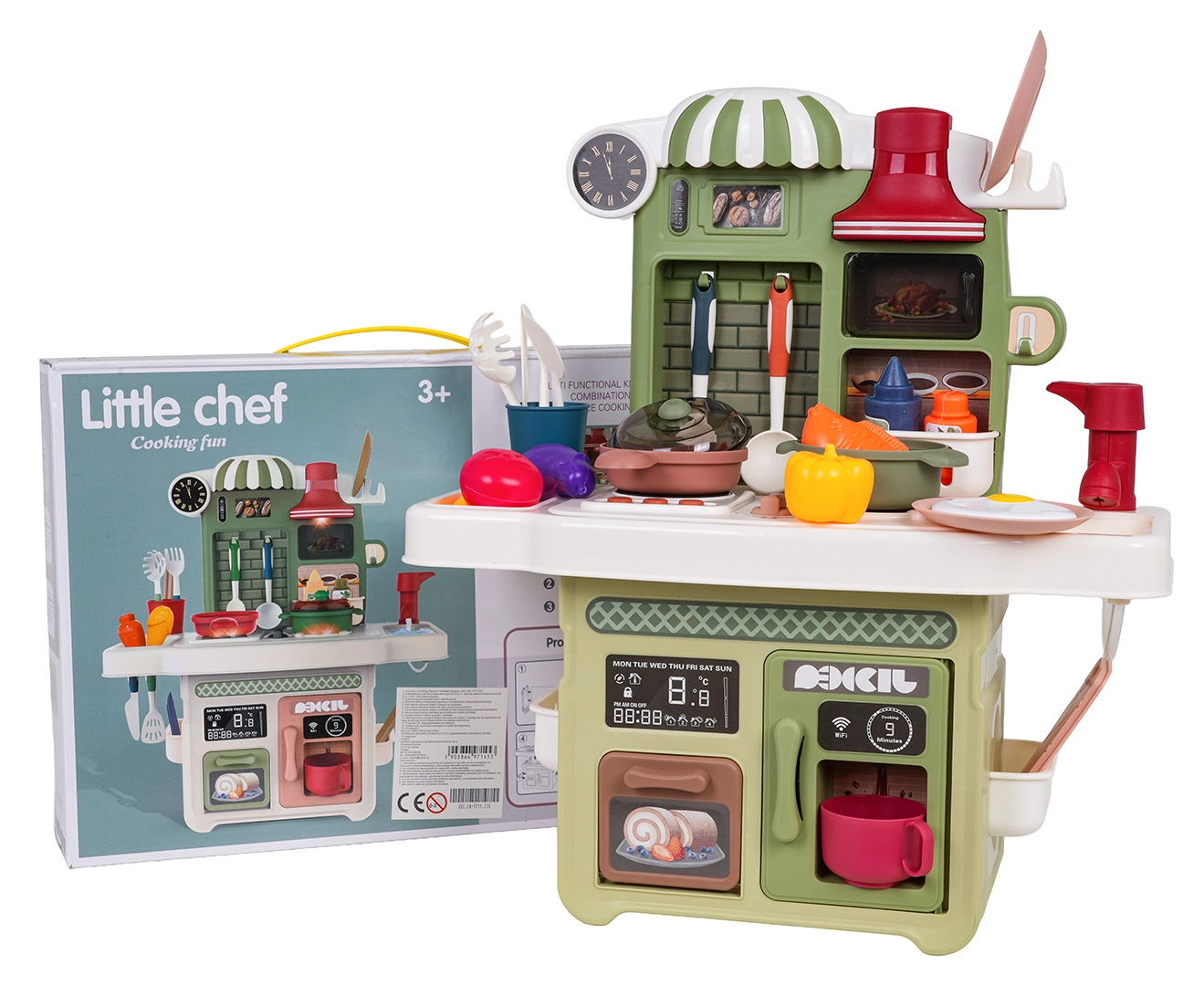 Rinkinį papildo veikiantis čiaupas su cirkuliuojančiu vandeniu (su pompute), tad vaikai gali „plauti“ indus kaip tikroje virtuvėje. Yra ir kavos aparato maketas, apšviestas gartraukis bei atsidaranti orkaitė. Daug priedų – puodai, keptuvės, lėkštutės, įrankiai ir maisto produktai – praplečia žaidimo galimybes.