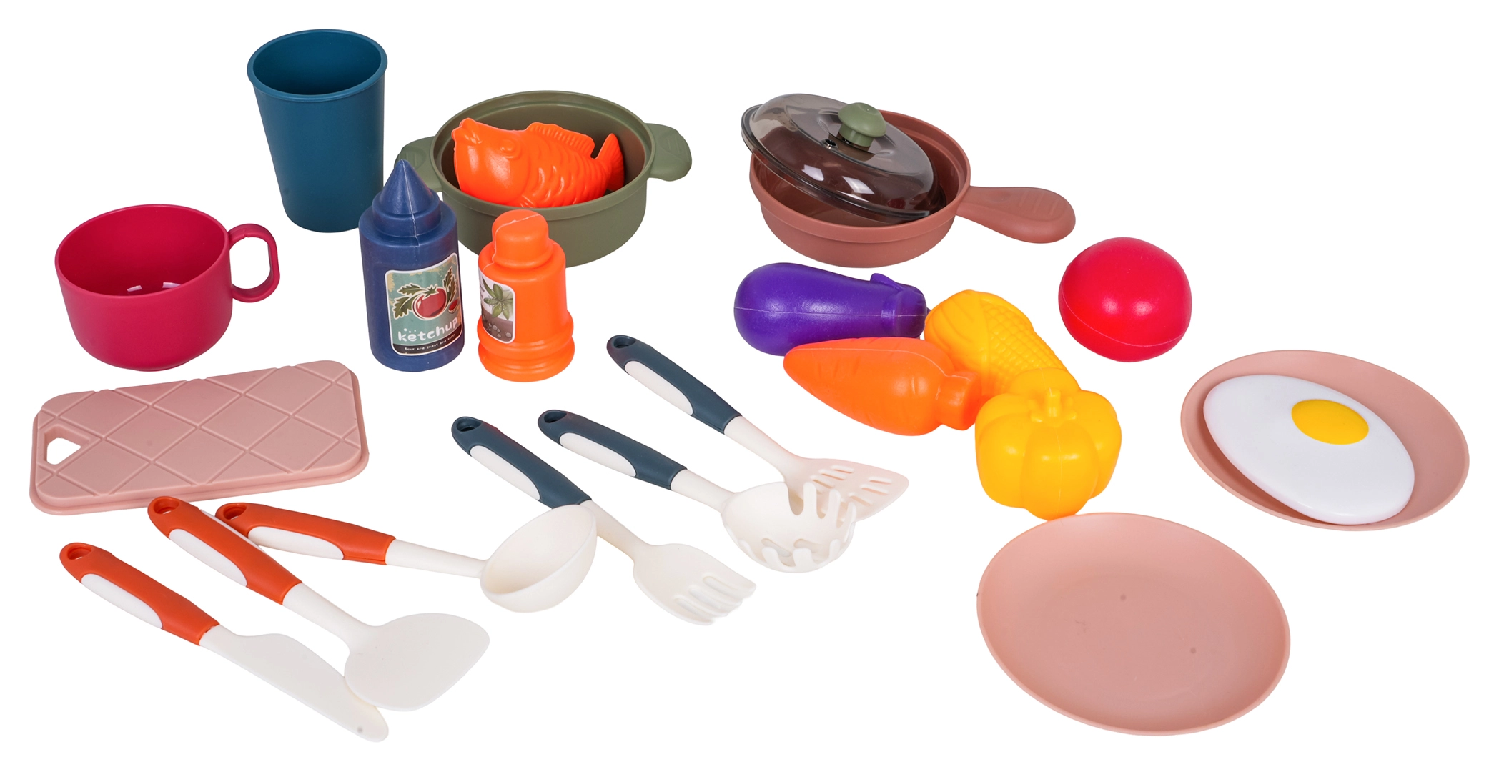 Keptuvė, puodas su dangčiu, lėkštutės, stalo įrankiai, virtuvės reikmenys ir žaisliniai maisto produktai – viskam yra vietos lentynėlėse, ant kabliukų ir orkaitėje.